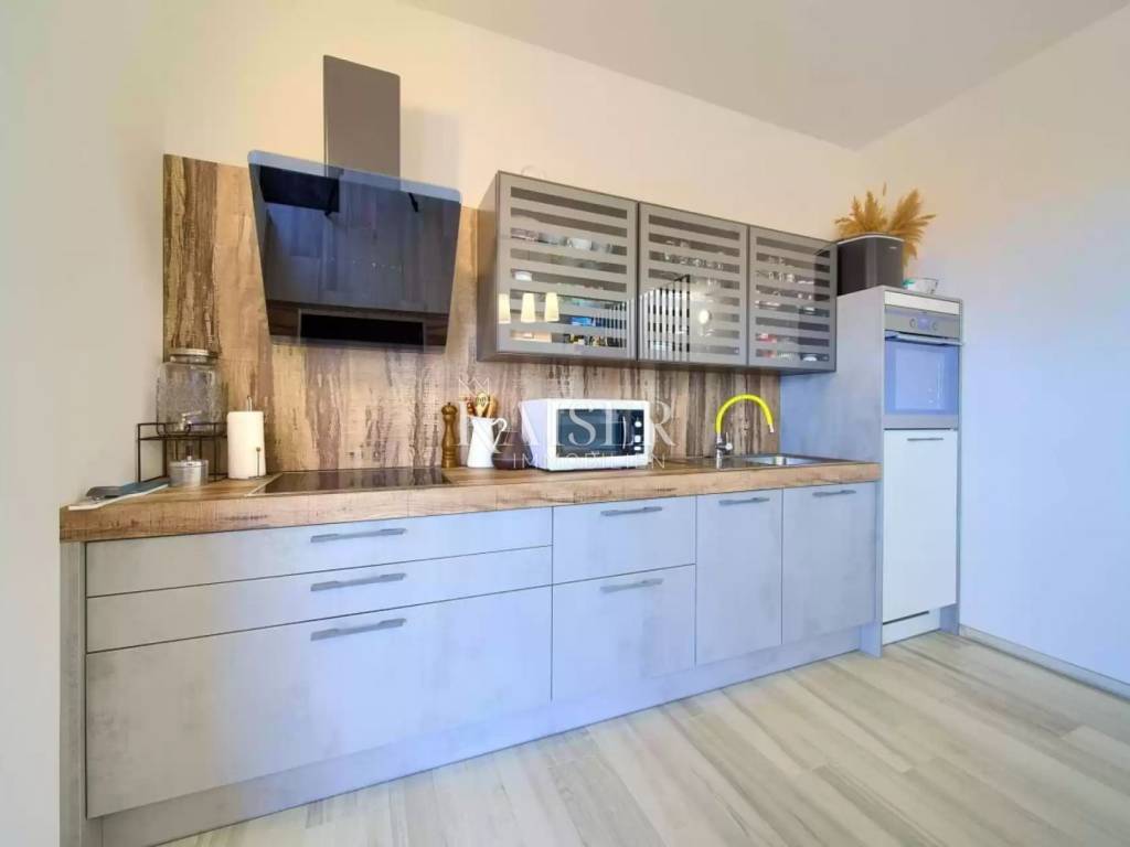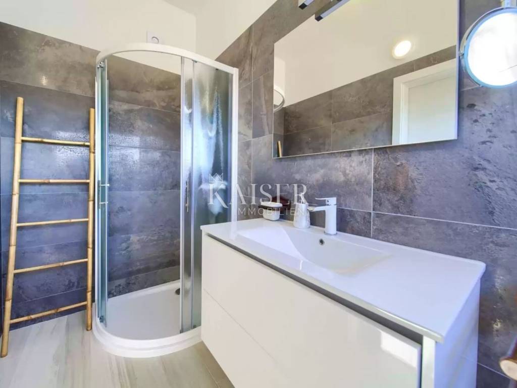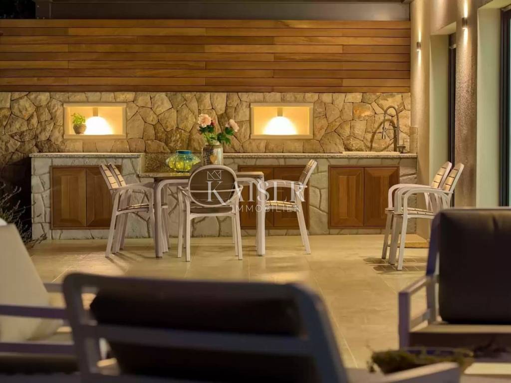 Ova impozantna nekretnina prostire se na tri etaže, s ukupnom stambenom površinom od 127 m2. U suterenu se nalazi konoba opremljena kuhinjom, toaletom i strojarnicom, dok prizemlje obuhvaća ulazni prostor, moderno uređeni dnevni boravak s blagovaonicom i kuhinjom, jednu spavaću sobu s vlastitom kupaonicom te izlaz na prostranu natkrivenu terasu. Na prvom katu smještene su tri prostrane spavaće sobe, dvije elegantno uređene kupaonice te terasa s očaravajućim panoramskim pogledom na more.