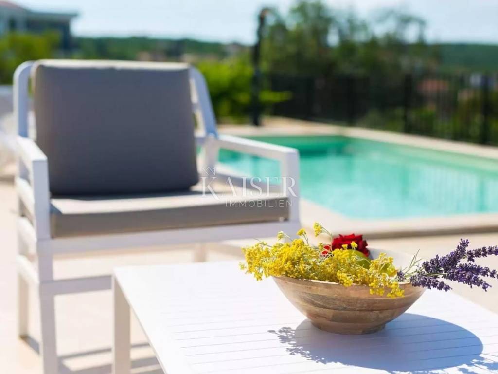 Prostrana okućnica obuhvaća 307 m2 i obogaćena je mediteranskim biljem, a njezin središnji dio čini grijani bazen od 25 m2 s pripadajućim sunčalištem i natkrivenom terasom. Vanjski prostor dodatno je opremljen ljetnom kuhinjom i roštiljem, omogućujući uživanje u gastronomskim delicijama na otvorenom, dok dva parkirna mjesta unutar ograđenog dvorišta osiguravaju praktičnost i sigurnost.