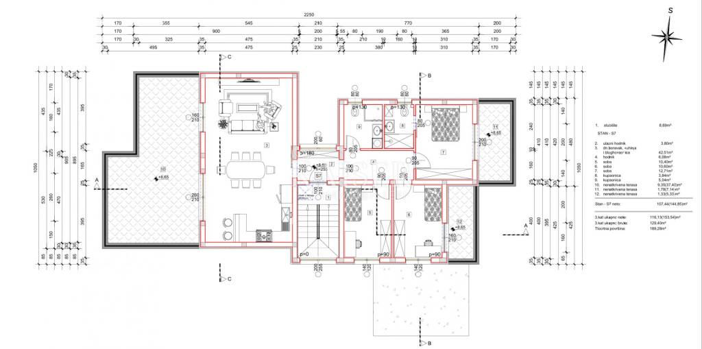 Ovaj jedinstveni stan na trećem, zadnjem katu, pruža apsolutnu privatnost, obilje sunčeve svjetlosti i prostrane terase stvorene za uživanje. S ukupnom neto površinom od 107,44 m², nudi beskompromisan luksuz i komfor.