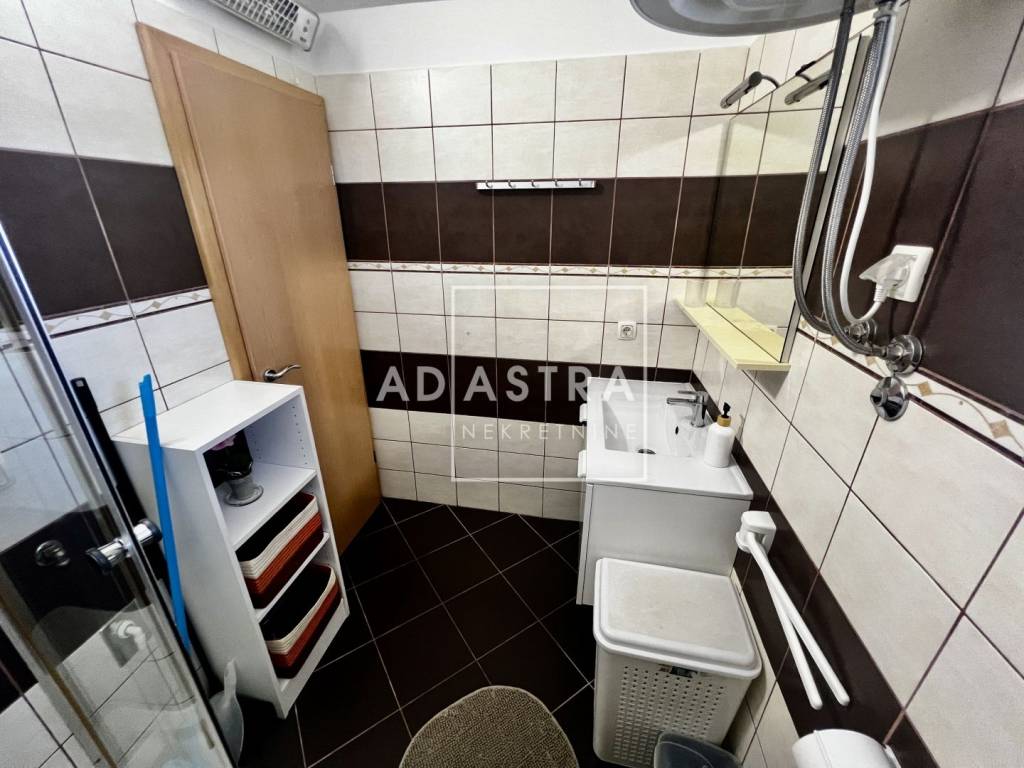 Opremljen je vanjskom PVC stolarijom s roletama i klimatskom jedinicom, dok su podovi obloženi keramikom i laminatom u sobama.