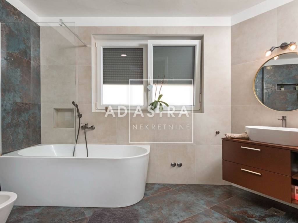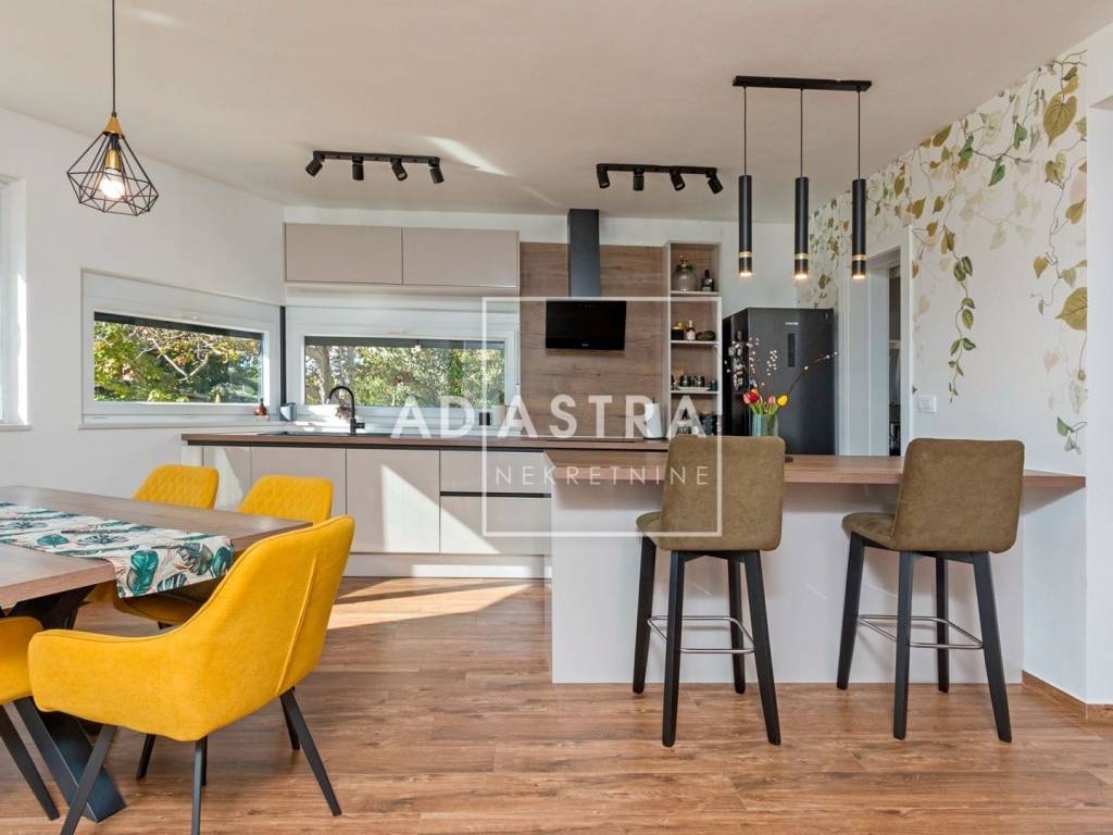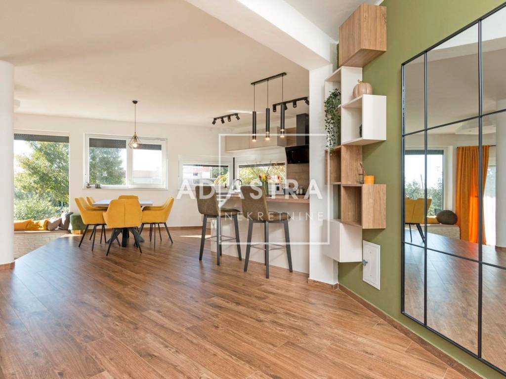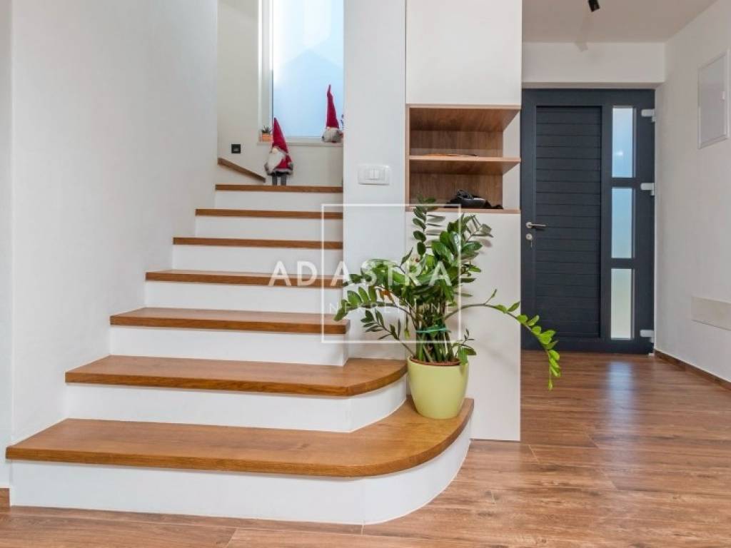 Kuća se nalazi na idiličnoj i mirnoj poziciji i proteže se na dva kata. Prizemlje se sastoji od sobe s kupaonicom, dnevnog boravka koji izlazi na natkrivenu terasu, blagovaone i kuhinje u open space konceptu. Pored kuhinje nalaze se ostava i praonica rublja. Prvi se kat sastoji od 3 sobe i 2 kupatila te predivne, prostrane terase sa staklenom ogradom i očaravajućim pogledom na okolnu prirodu.