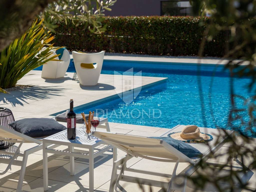 Okućnica kuće prati energiju cijele kuće te mami svoje goste da izađu među stoljetne masline na prostrana sunčališta, veliki bazen od 65m2 sa plitkim djelom za najmlađe ili one željne odmora u plićaku te ručanje na natkrivenoj terasi u hladu pokraj roštilja. Sa stražnje strane kuće nalazi se i garaža za automobili koja može poslužiti kao dodatna ostava za višak stvari i opreme.
