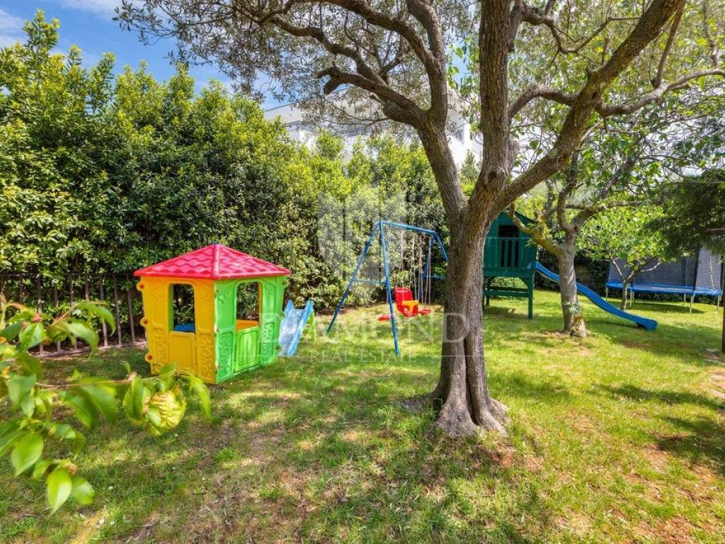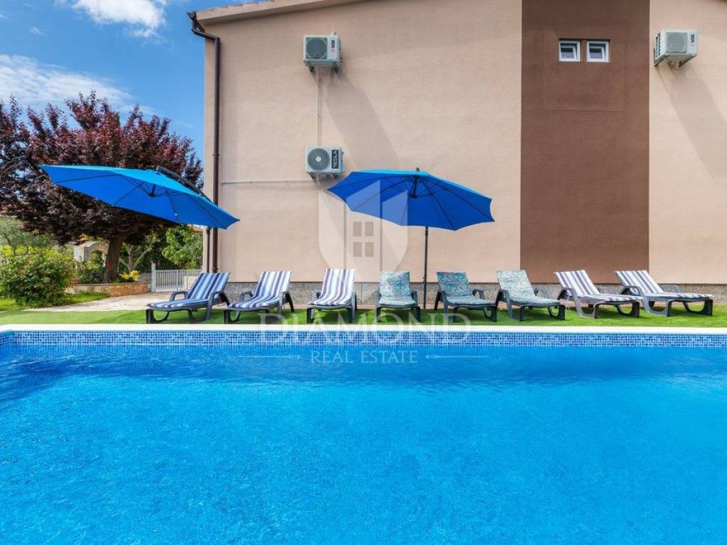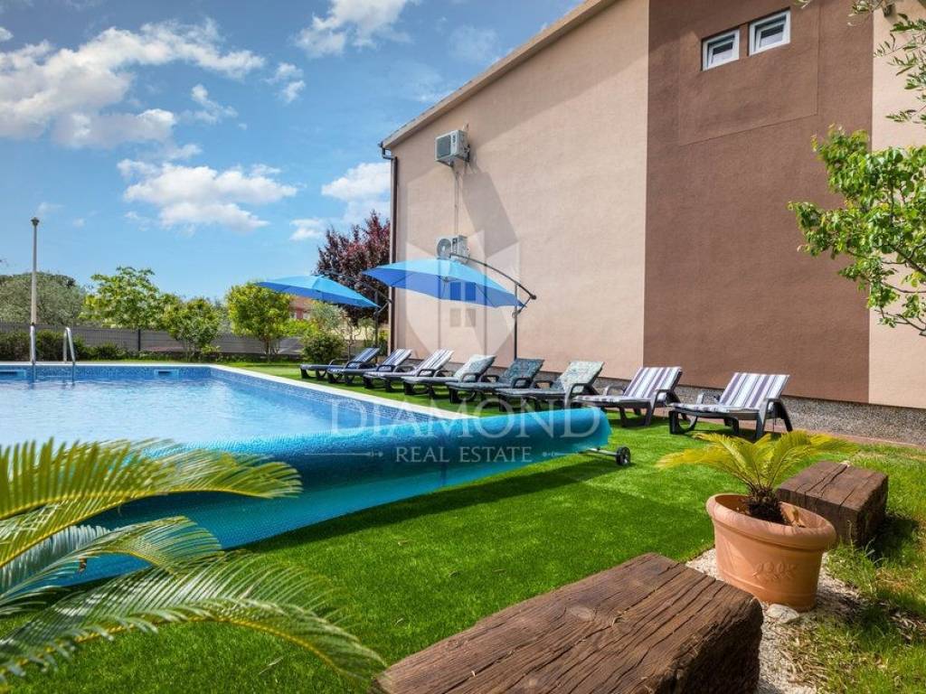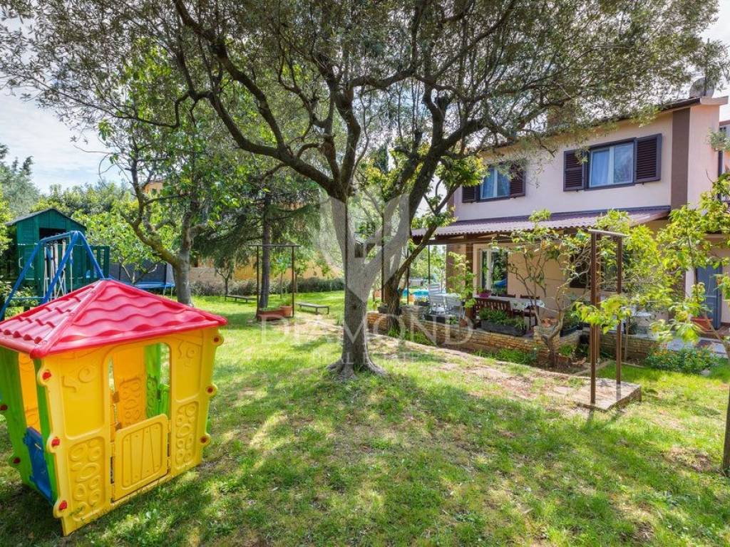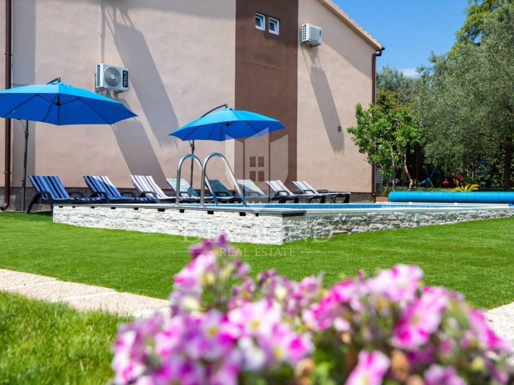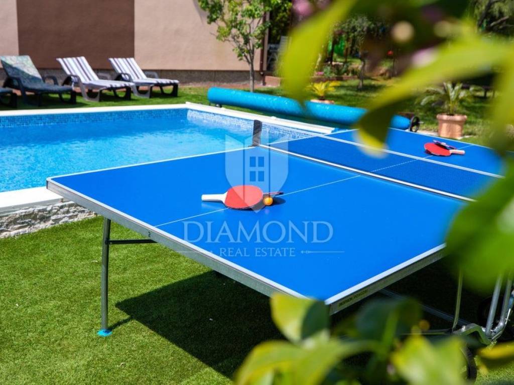 Kuća se nalazi u mirnoj, slijepoj ulici, udaljena svega 400 m od prve plaže što ju čini idealnom za život iz snova. Kuća se prostire kroz dvije etaže, ukupne stambene površine 200 m2 i prostrane okućnice od 1.100 m2. Prizemlje kuće sastoji se od hodnika, dnevnog boravka s izlazom na prekrasnu otvorenu terasu, moderno opremljene kuhinje s blagovaonicom i izlazom na natkrivenu terasu, ostave i kupaonice, dok na prvom katu nalazi se hodnik s dvije kupaonice i četiri udobne spavaće sobe od kojih dvije imaju izlaz na balkon s prekrasnim pogledom na more i Nacionalni park Brijune. Balkon na prvom katu pruža nevjerojatan pogled te svakako je među omiljenim prostorijama za jutarnje ispijanje kave. U sklopu kuće nalazi se i bazen od 32 m2 smješten na prostranoj okućnici koja pruža savršeno mjesto za opuštanje i uživanje na otvorenom. Osim bazena tu se nalazi dječje igralište, ležaljke, vanjski tuš, kamin i oblije zelenila koje pruža osjećaj mira. Garaža i otvorena parkirna mjesta osiguravaju dovoljno prostora za nekoliko automobila. Kuća je kompletno renovirana 2022. godine.