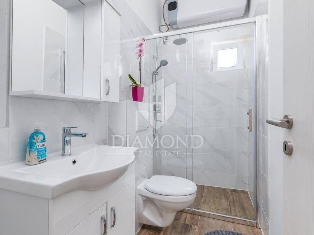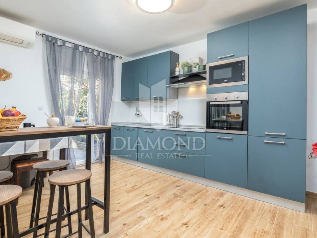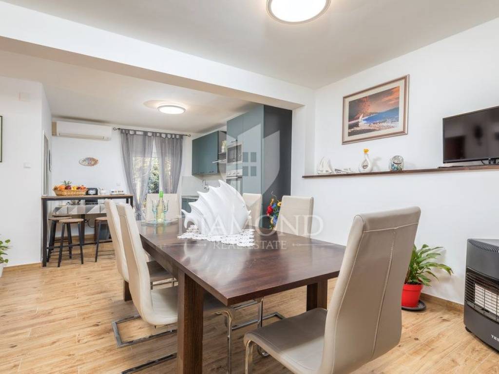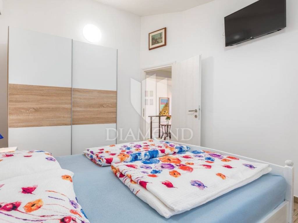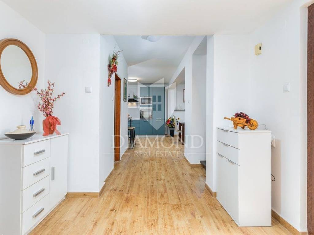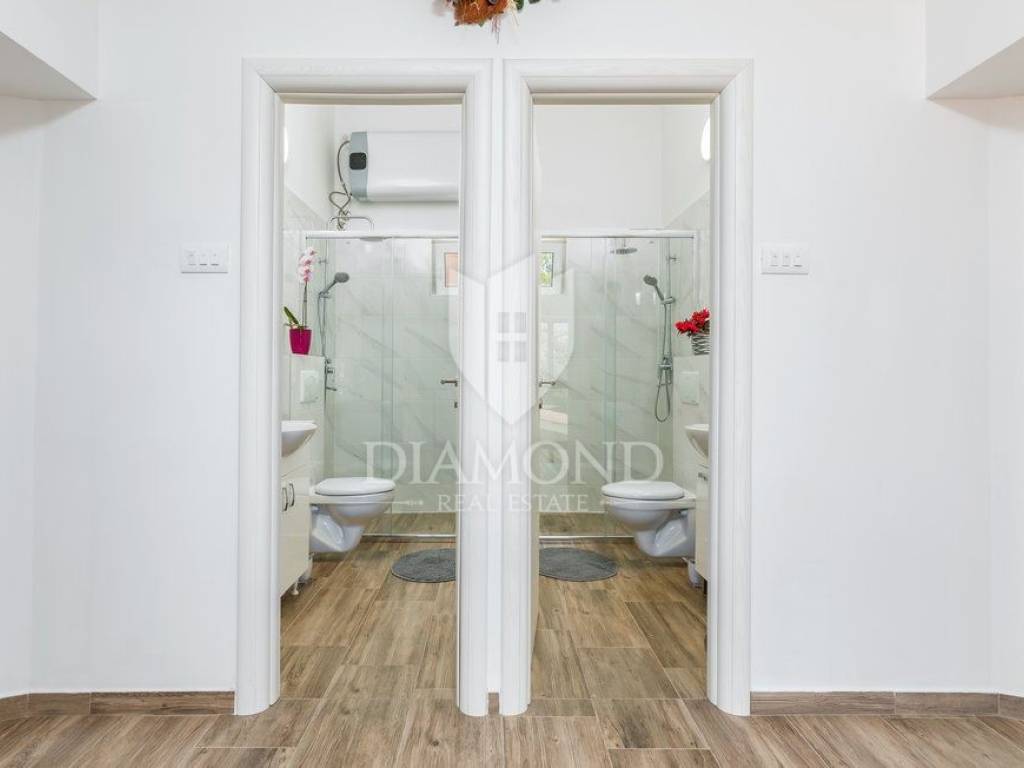 Kuća se nalazi u mirnoj, slijepoj ulici, udaljena svega 400 m od prve plaže što ju čini idealnom za život iz snova. Kuća se prostire kroz dvije etaže, ukupne stambene površine 200 m2 i prostrane okućnice od 1.100 m2. Prizemlje kuće sastoji se od hodnika, dnevnog boravka s izlazom na prekrasnu otvorenu terasu, moderno opremljene kuhinje s blagovaonicom i izlazom na natkrivenu terasu, ostave i kupaonice, dok na prvom katu nalazi se hodnik s dvije kupaonice i četiri udobne spavaće sobe od kojih dvije imaju izlaz na balkon s prekrasnim pogledom na more i Nacionalni park Brijune. Balkon na prvom katu pruža nevjerojatan pogled te svakako je među omiljenim prostorijama za jutarnje ispijanje kave. U sklopu kuće nalazi se i bazen od 32 m2 smješten na prostranoj okućnici koja pruža savršeno mjesto za opuštanje i uživanje na otvorenom. Osim bazena tu se nalazi dječje igralište, ležaljke, vanjski tuš, kamin i oblije zelenila koje pruža osjećaj mira. Garaža i otvorena parkirna mjesta osiguravaju dovoljno prostora za nekoliko automobila. Kuća je kompletno renovirana 2022. godine.