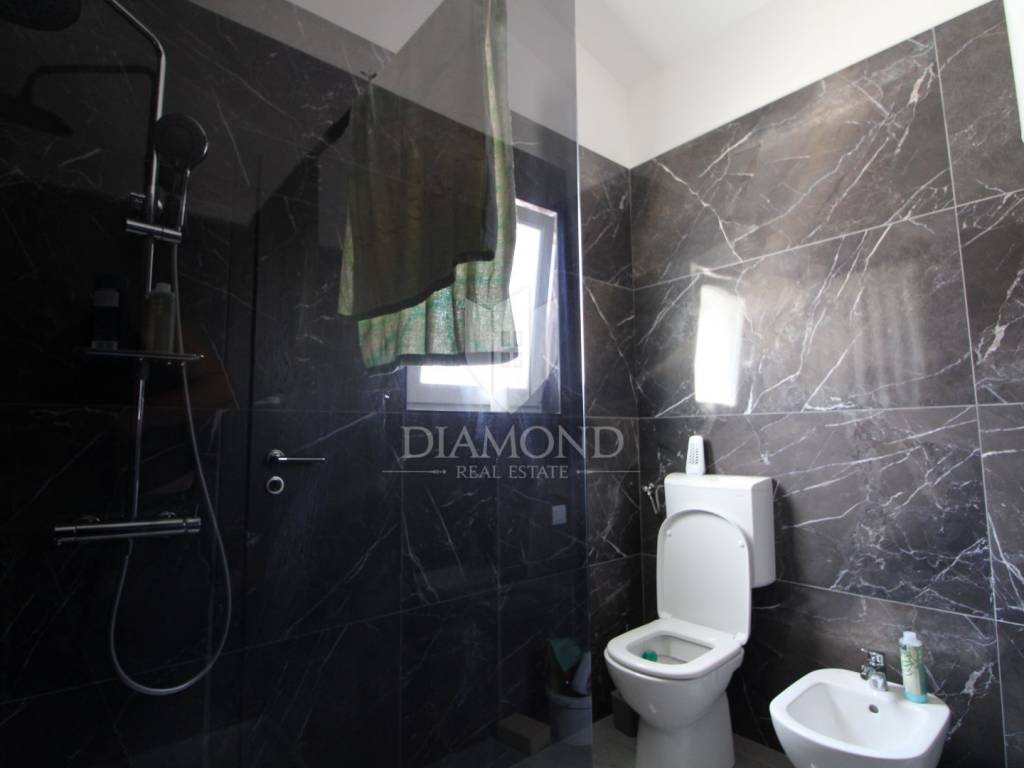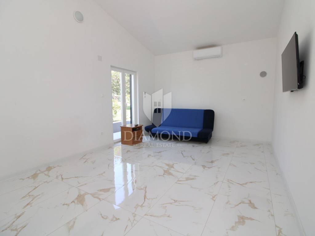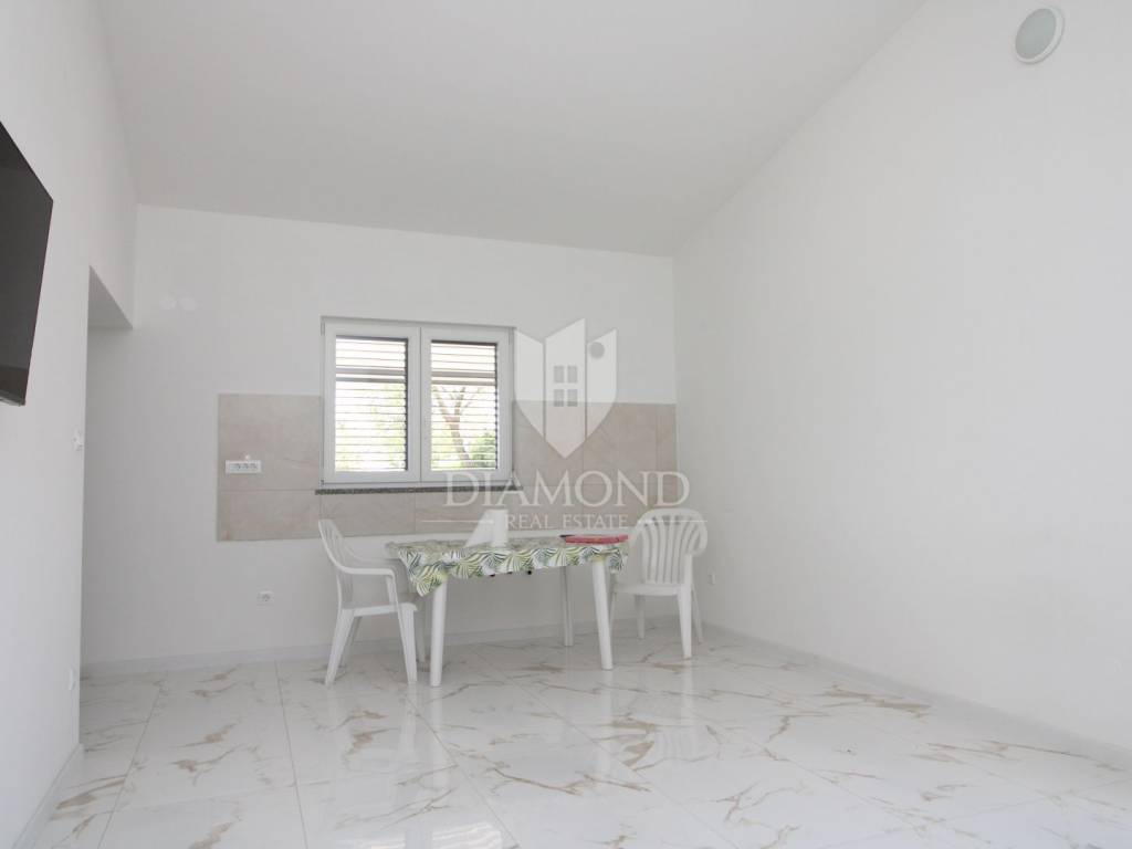 Unutrašnjost kuće nudi skladan spoj funkcionalnosti i udobnosti. Otvoreni dnevni prostor obuhvaća moderno uređenu kuhinju, blagovaonicu i udoban dnevni boravak, stvarajući toplu i prijatnu atmosferu. Dodatnu udobnost pruža prostrana spavaća soba i praktično kupatilo.