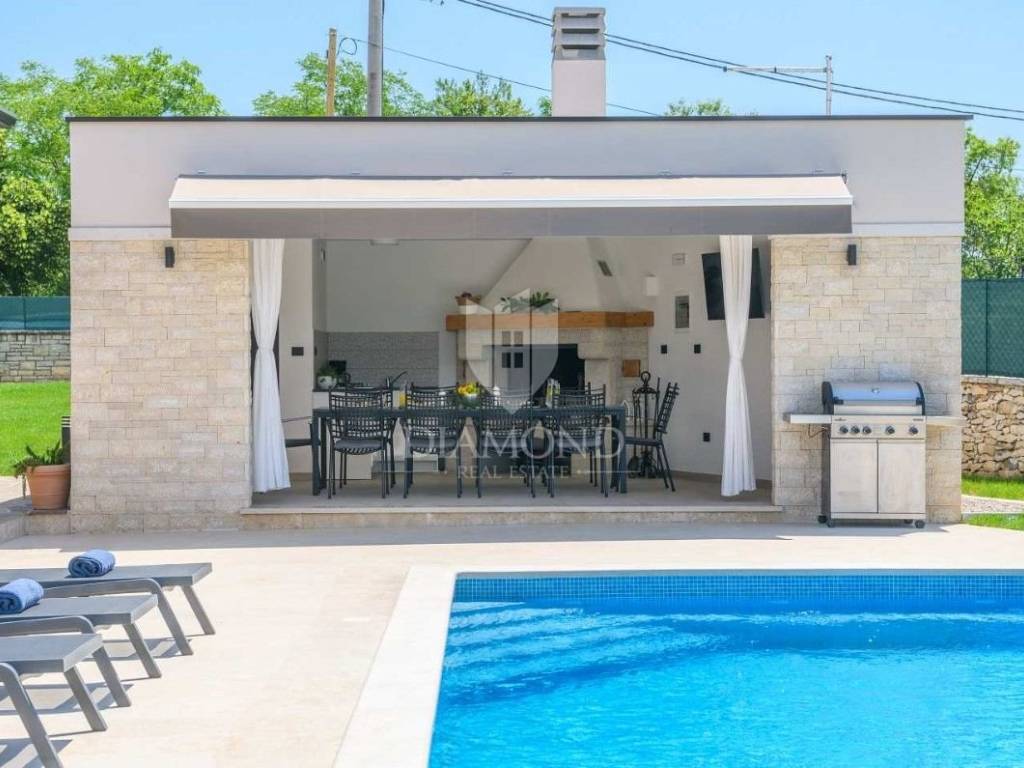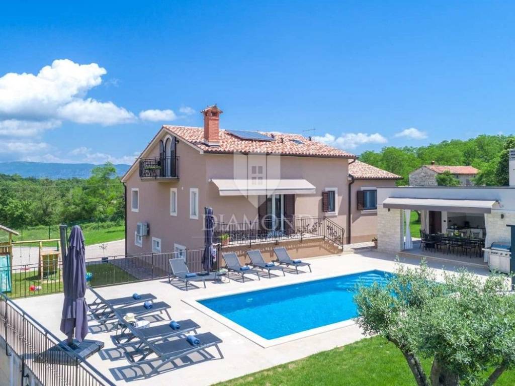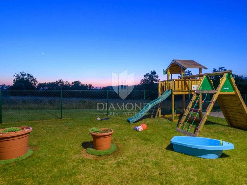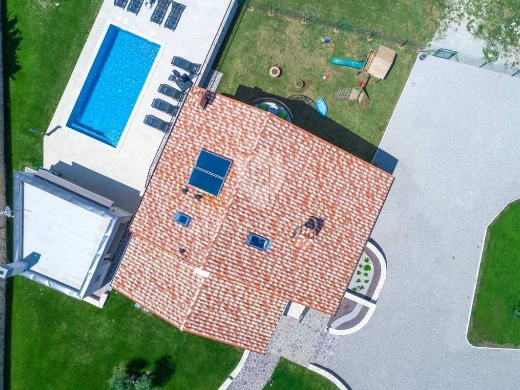 Na lijepo uređenoj okućnici ističu se bazen, idealan za osvježenje i opuštanje u toplim ljetnim danima, ljetna kuhinja s dodatnim WC-om za praktičnost tijekom boravka na otvorenom, parking prostor za više vozila te dječje igralište, što čini ovu kuću savršenim izborom za obitelji.