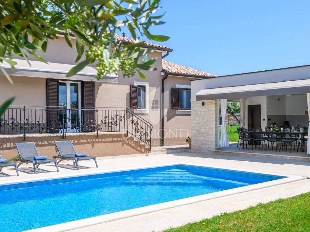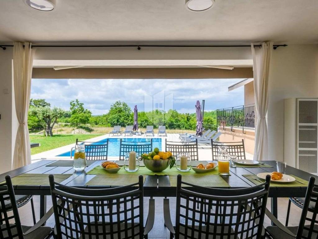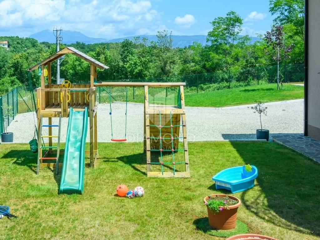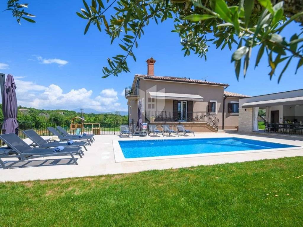 Na lijepo uređenoj okućnici ističu se bazen, idealan za osvježenje i opuštanje u toplim ljetnim danima, ljetna kuhinja s dodatnim WC-om za praktičnost tijekom boravka na otvorenom, parking prostor za više vozila te dječje igralište, što čini ovu kuću savršenim izborom za obitelji.
