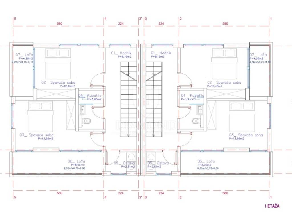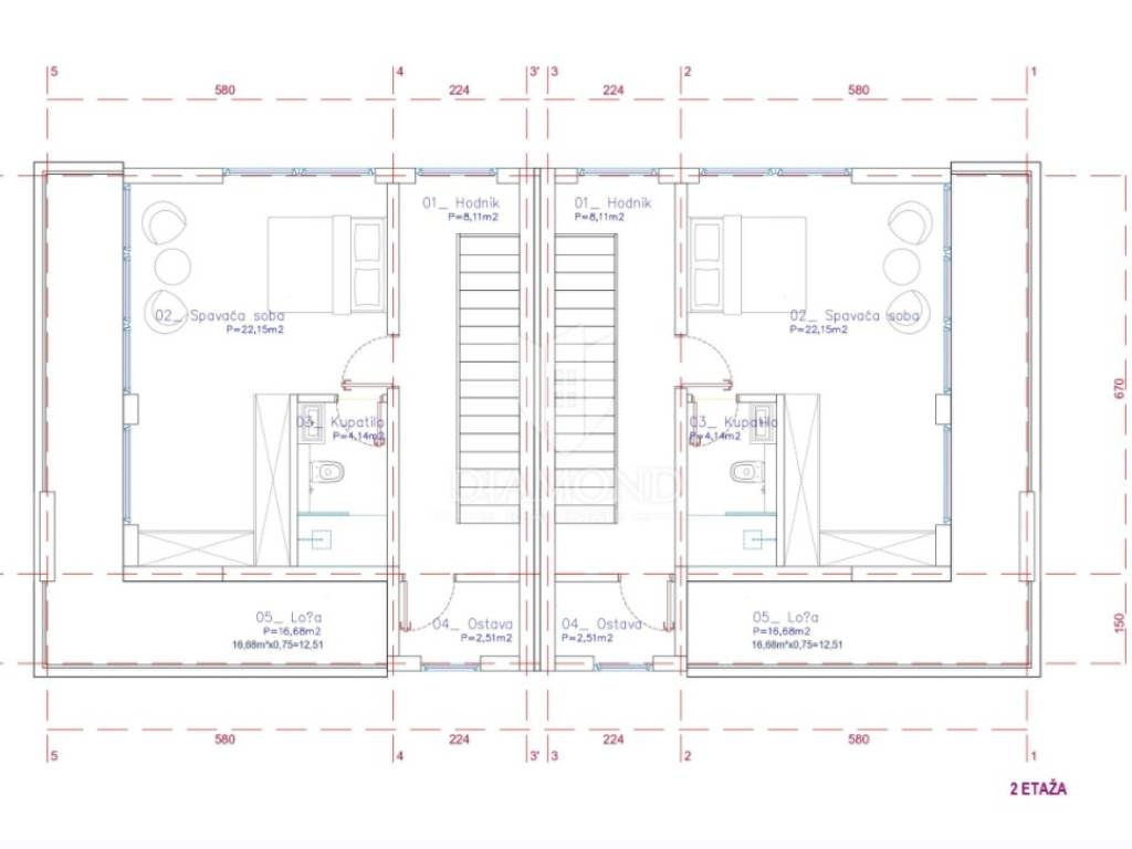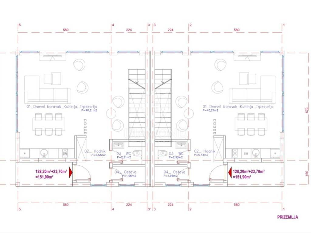 Idejni projekt sadrži dvojnu zgradu koja u prizemlju ima otvoreni prostor (kuhinja, dnevni boravak i blagovaonica, hodnik, wc i ostava). Na kat se dolazi stepenicama na kojem se nalaze dvije sobe, kupaonica, dvije lože i ostava. Na drugom katu nalazi se prostrana soba te kupaonica koja je povezana s balkonom i ostava. Okolo parcele nalaze se obiteljske kuće, manje stambene zgrade i kuće za odmor.