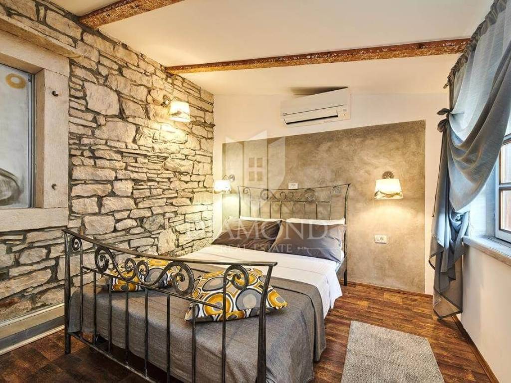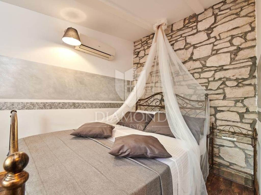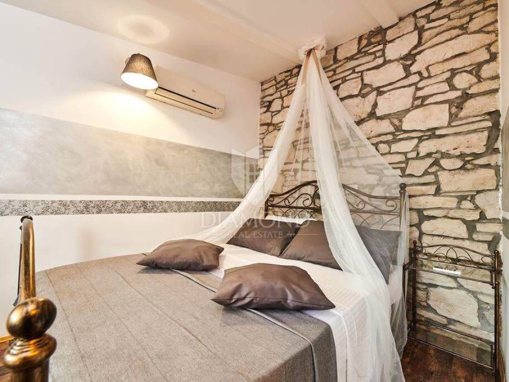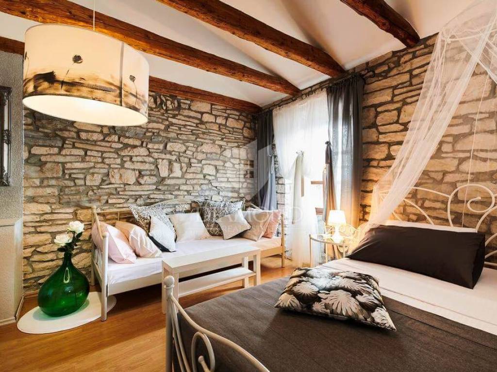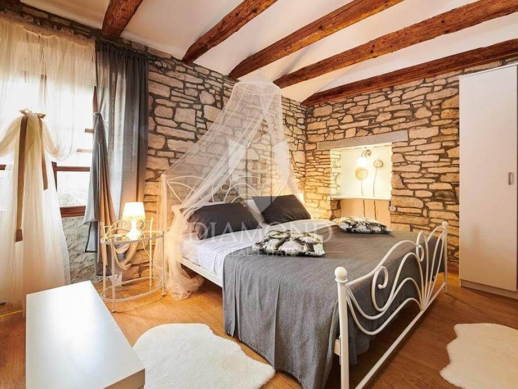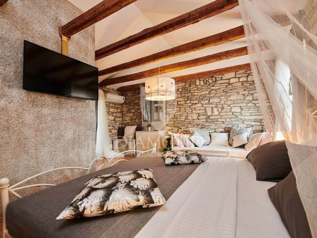 Površina objekta iznosi 650 m2 koje je smješteno na zemljištu veličine 3440 m2, zemljište je u potpunosti građevinsko i pruža novom vlasniku mogućnost da proširi poslovanje kao dodatni smještaj ili dodatni sadržaj za goste. Objekt se prostire na prizemlje i kat. U prizemlju se nalazi konoba, na katu se nalaze 5 soba sa vlastitim kupaonicama, u produžetku konobe nalaze se još dva apartmana. Sobe su veličine 2 x 14 m2,2 x 16 m2 i 1 x 24 m2, dok su apartmani veličine 2 x 48m2.