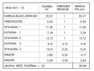Stan se nalazi na drugom katu zgrade koja je trenutno u fazi dogradnje i potpune renovacije. Prostire se na izdašnoj kvadraturi od 90m2 te uključuje tri spavaće sobe, dvije moderno uređene kupaonice, te prostrani dnevni boravak povezan s kuhinjom i blagovaonicom u konceptu otvorenog prostora. Zahvaljujući dva balkona, stan je pun prirodnog svjetla, a boravak na otvorenom moguć je u različitim dijelovima dana. Idealan je za veće obitelji, ali i kao investicija za turistički najam.