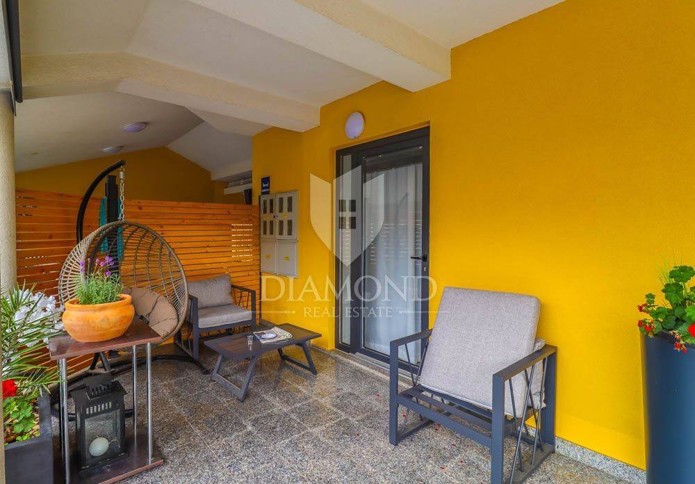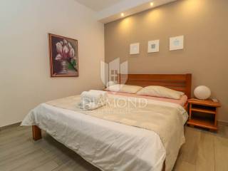 Svaki apartman je moderno opremljen i uređen. Također svaki apartman ima svoj balkon. Sa balkona se prostire prekrasan pogled na more i Pješčanu Uvalu. Vila također posjeduje konobu u kojoj se nalazi roštilj i kuhinja. Na okućnici ima 7 parkirnih mjesta i stanovi u prizemlju imaju izlaz u dvorište.