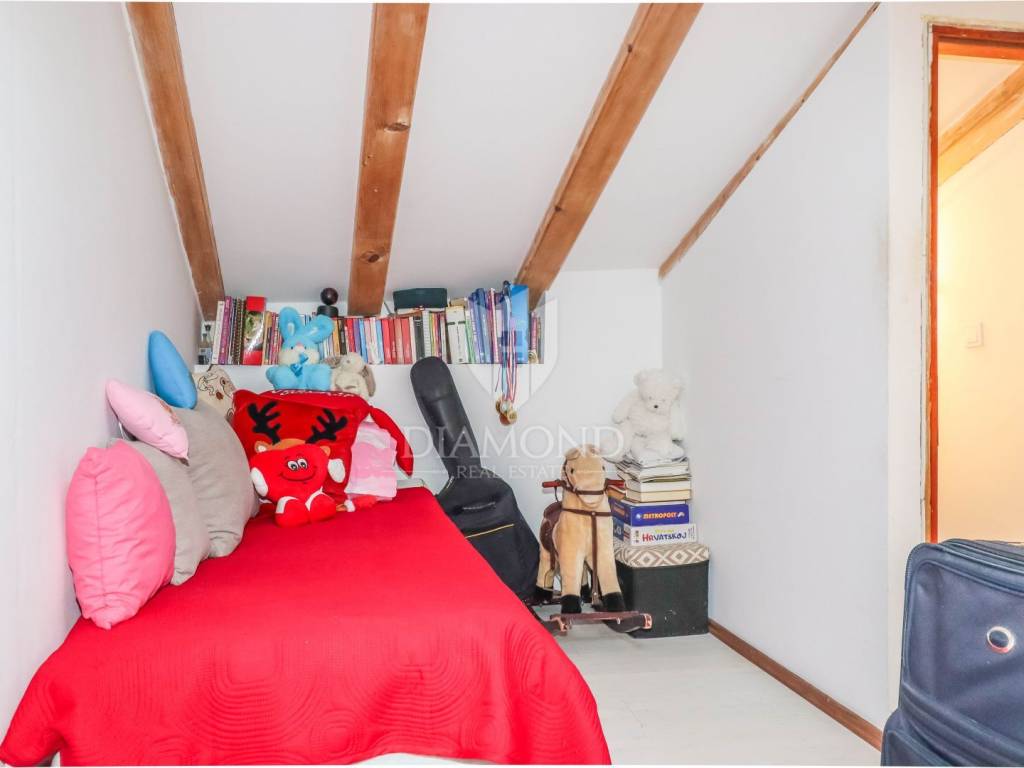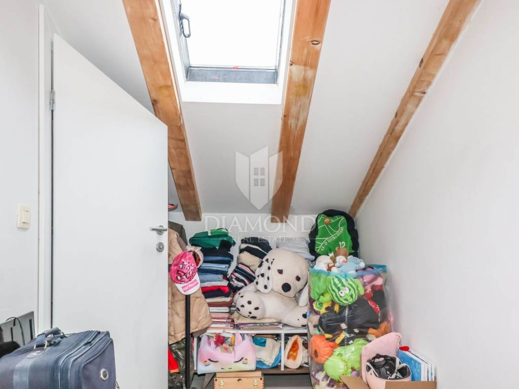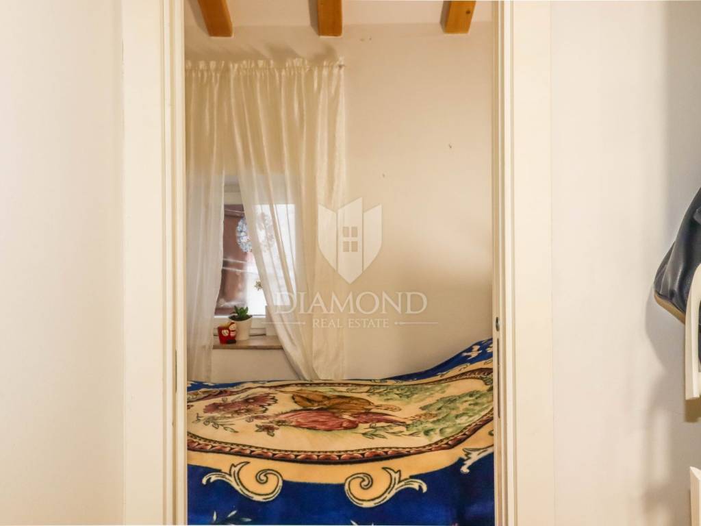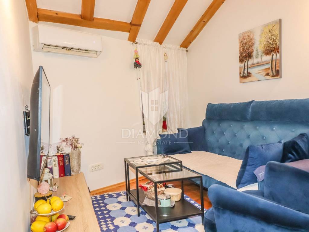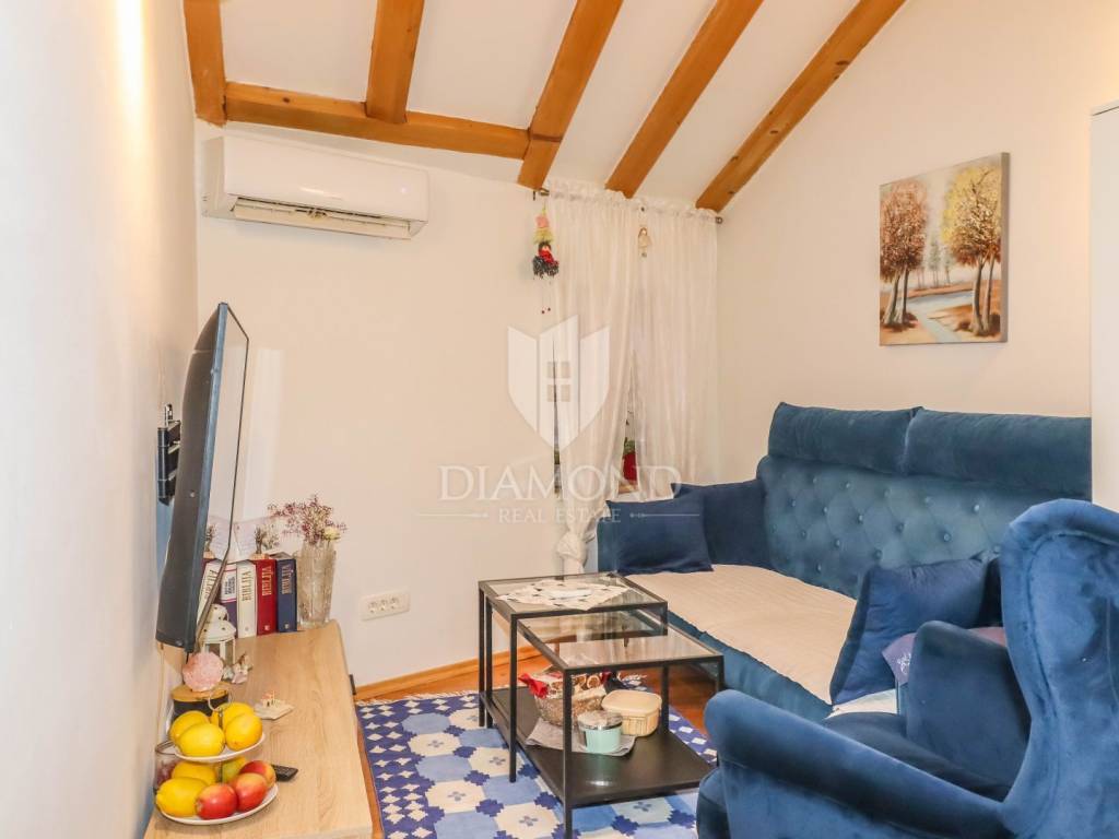 Stan se proteže na trećem katu i potkrovlju autentične kamene kuće te ima ukupnu površinu od 40 m². Prostor je pažljivo organiziran i maksimalno iskorišten, a sastoji se od dvije spavaće sobe, dvije moderne kupaonice, udobnog dnevnog boravka te funkcionalne kuhinje s blagovaonicom. Interijer odiše toplinom i stilom, s elegantnim detaljima i kvalitetnim materijalima koji stvaraju ugodnu atmosferu.