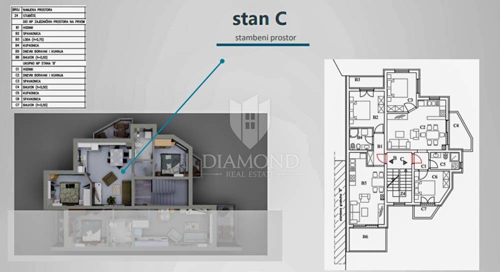 Ovaj stan se smjestio na prvom katu zgrade. Sastoji se od otvorenog prostora koji dijele kuhinja dnevni boravak i blagovaonica sa izlazom na terasu. Tu se nalaze i dvije spavaće sobe, jedna sa vlastitom terasom te kupaonica. Stanu pripada i parking mjesto ispred zgrade. Ukupna neto površina iznosi 58m2.