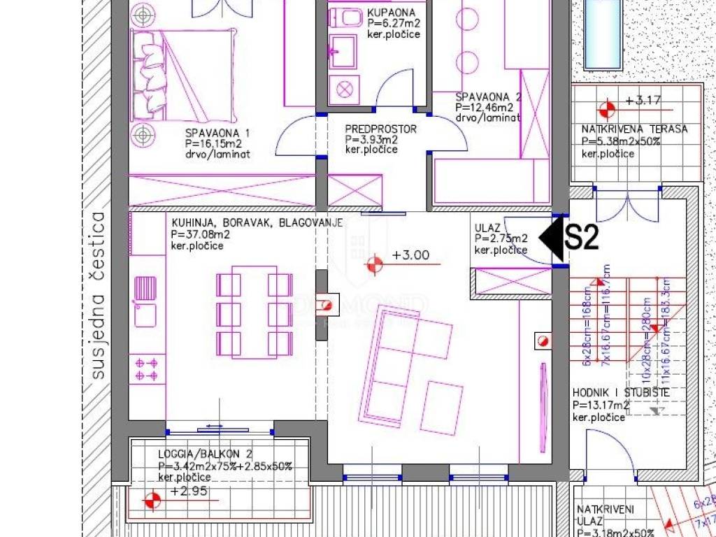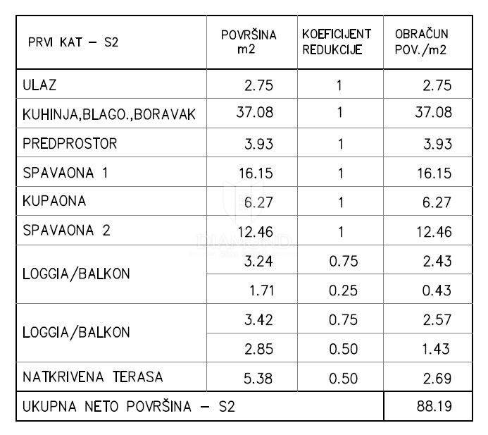 Stan se nalazi na na prvome katu stambene zgrade koja se trenutno dograđuje i u potpunosti renovira. Isti se sastoji se od dvije spavaće sobe, jedne kupaonice te prostranog dnevnog boravka, povezanog s kuhinjom i blagovaonicom. Stan ima tri balkona, što omogućuje obilje prirodnog svjetla i boravak na otvorenom tijekom cijelog dana.