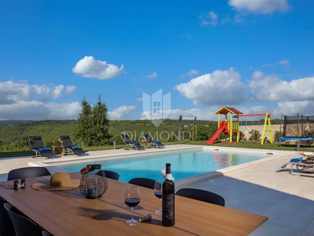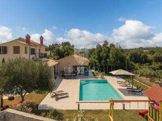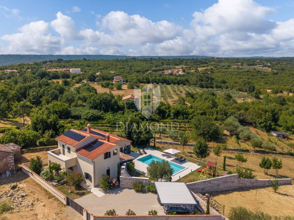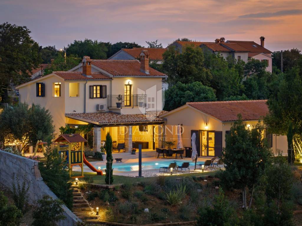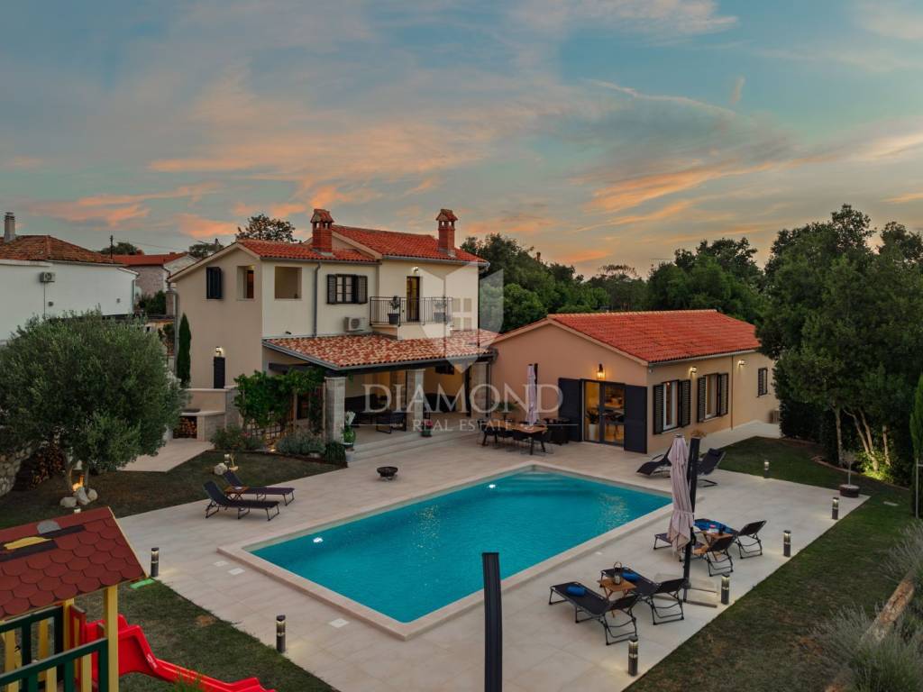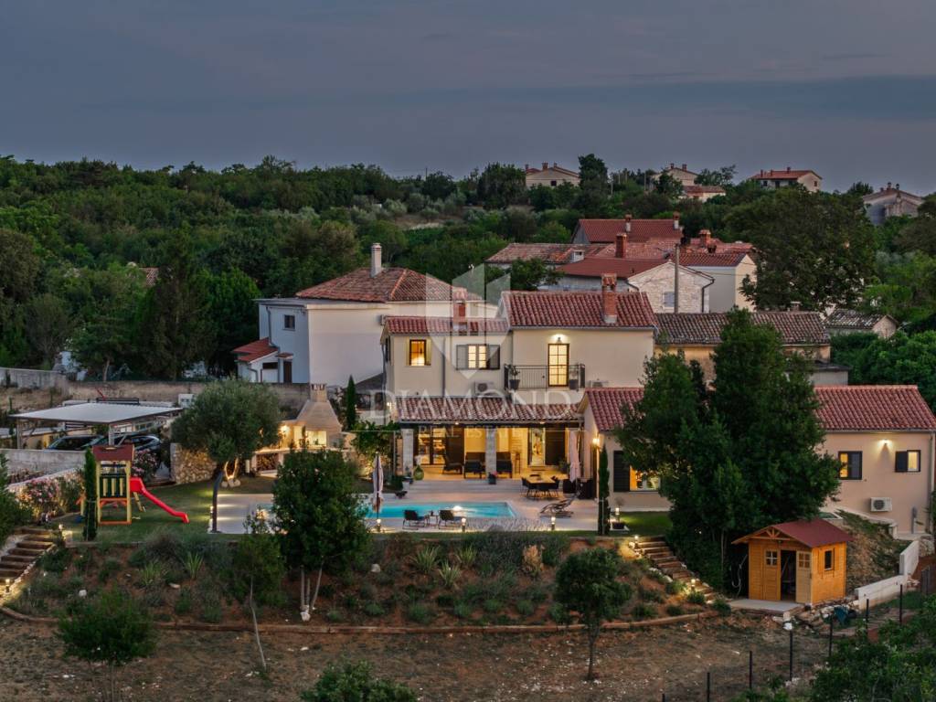 Okućnica se prostire na prostranih 2459 m2 i nudi obilje prostora za opuštanje na otvorenom, druženje s prijateljima i obitelji te uživanje u prekrasnom krajoliku. Parkić za djecu gdje se mogu zabavljati na ljuljačkama, toboganu ili trampolinu. U nastavku natkrivene terase koja omogućava ugodan odmor u hladovini tijekom cijelog dana i pogled na prekrasno uređenu okućnicu i bazen, nalazi se i vanjska ljetna kuhinja za praktična i funkcionalna druženja na otvorenom.