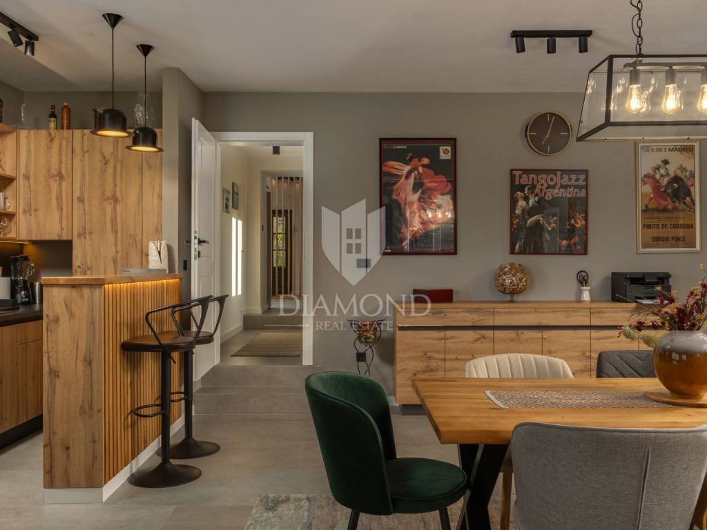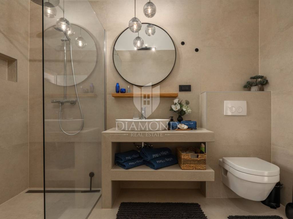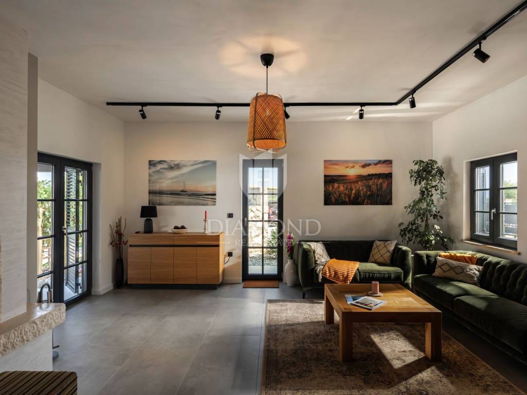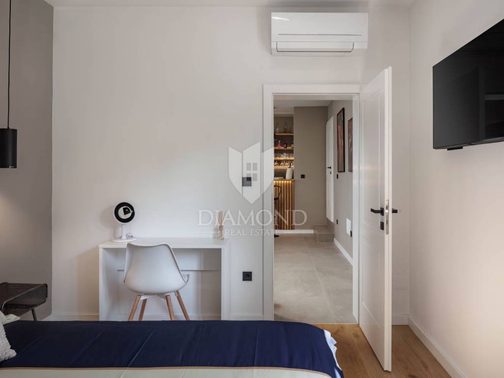 Unutrašnjost vile uređena je s najfinijim Natuzzi namještajem, pružajući vrhunsku udobnost i luksuz. Svaka prostorija je pažljivo dizajnirana kako bi stvorila harmoničan i elegantan te funkcionalan ambijent.