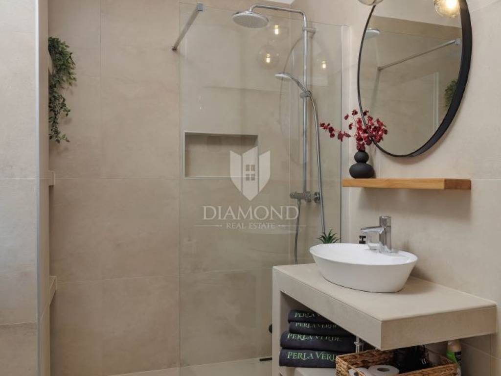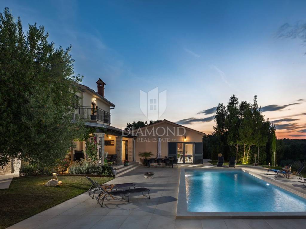 Vila se ističe svojim jedinstvenim karakteristikama, uključujući i impresivni grijani bazen od 50m² koji pruža osvježenje i relaksaciju uz maksimalnu privatnost uređenog dvorišta.