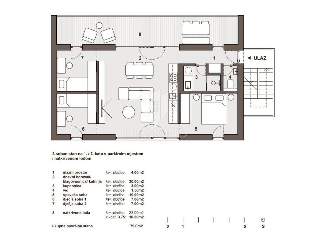 Stan površine 79 m² sastoji se od dnevnog boravka s kuhinjom i blagovaonicom, 3 spavaće sobe i kupaonice, wc za goste i hodnika. Iz dnevnog dijela pristupa se velikoj terasi površine 22 m² idealnoj za sva ljetna druženja. Grijanje je predviđeno putem klima uređaja. Parkirno mjesto uključeno u cijenu.