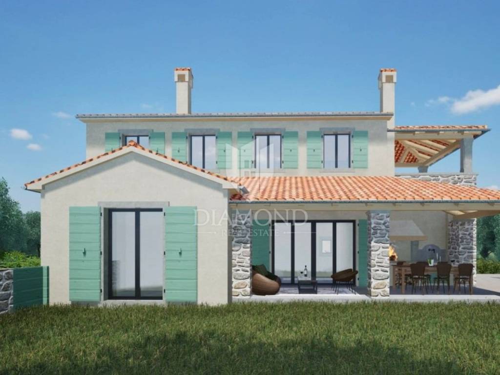 U okolici Novigrada, u mirnom naselju, okruženom zelenilom, svega nekoliko minuta vožnje od mora i šetnica nalazi se ova moderna kuća.