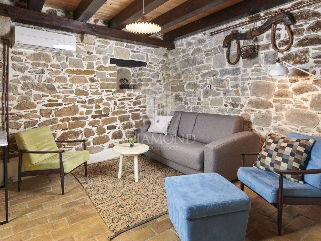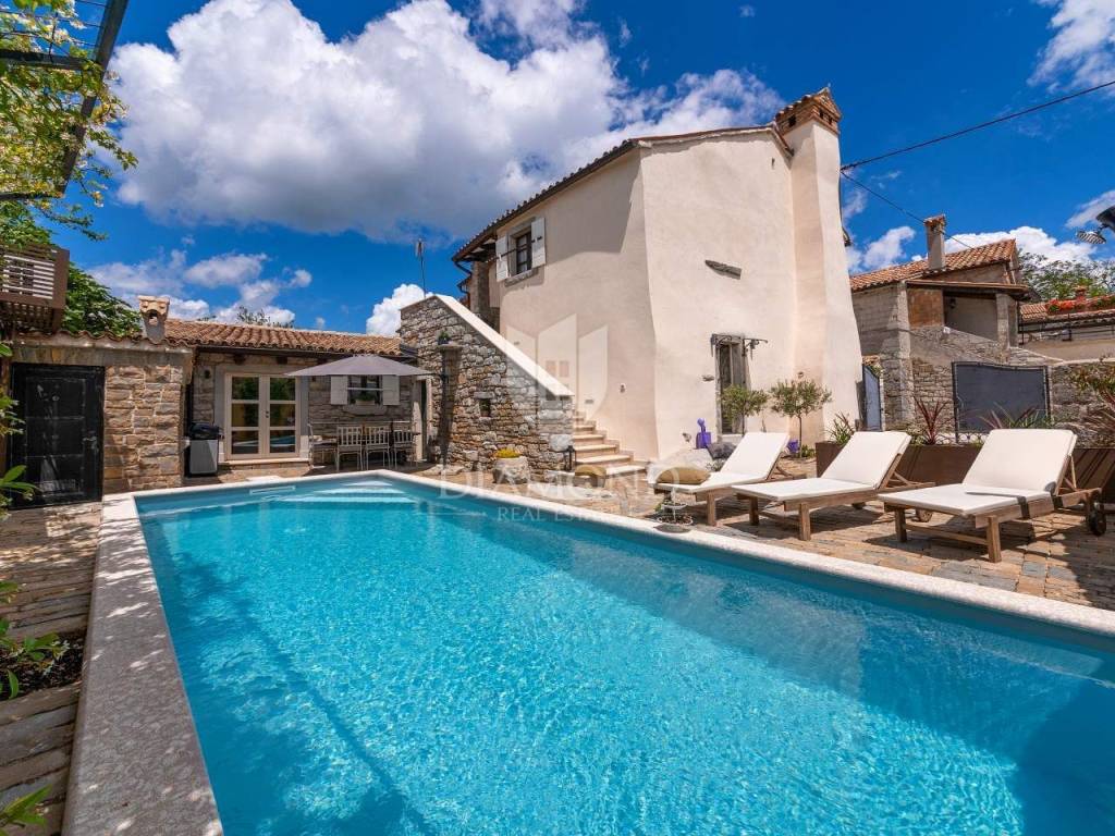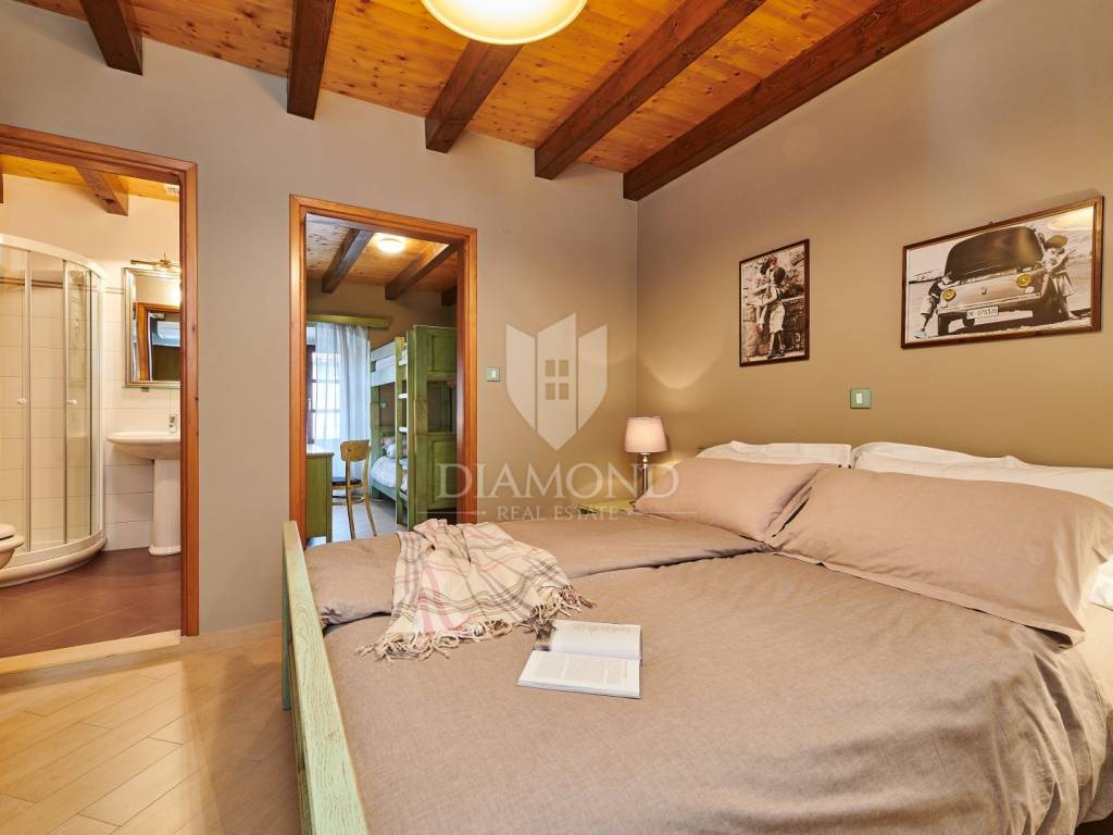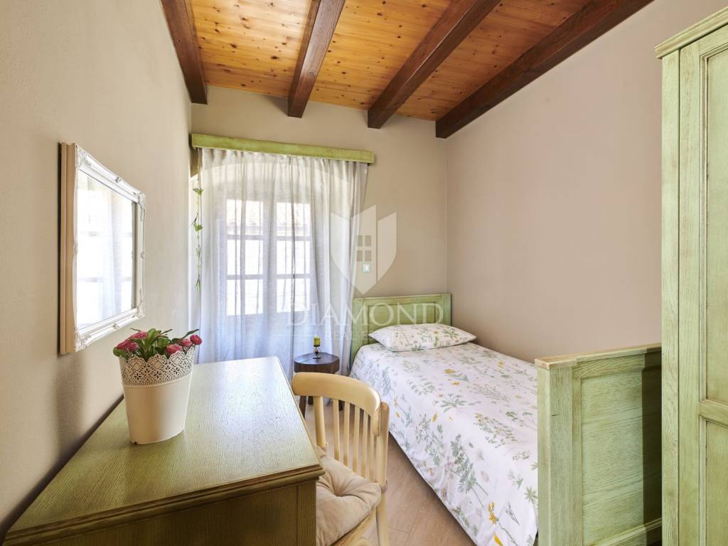 Vanjski prostor jednako je dojmljiv: natkrivena terasa s kamenim kaminom poziva na druženje i večere pod zvjezdanim nebom, dok bazen i sunčalište stvaraju pravu oazu mira. Dvorište, popločeno autentičnim kamenim pločama i ograđeno zidom, pruža potpunu privatnost, a pažljivo odabrani materijali – lokalni kamen, drvo i opeka – daju cijeloj kući poseban istarski šarm. Vila je potpuno opremljena, klimatizirana i kategorizirana za turistički najam, s već uhodanim poslovanjem, što omogućuje trenutni nastavak djelatnosti i siguran povrat investicije.