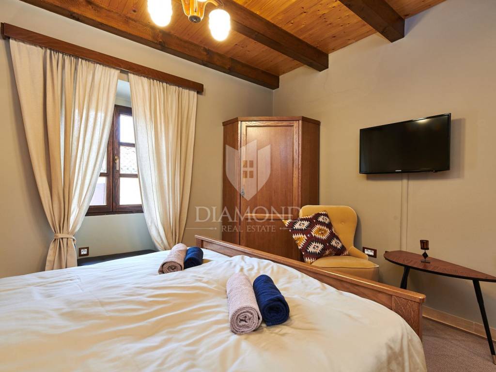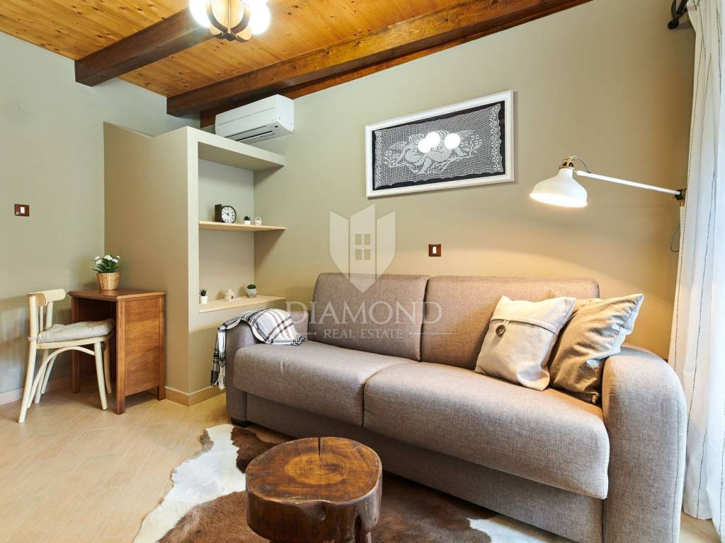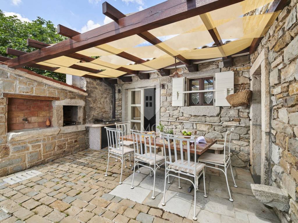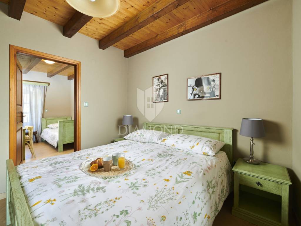 Vanjski prostor jednako je dojmljiv: natkrivena terasa s kamenim kaminom poziva na druženje i večere pod zvjezdanim nebom, dok bazen i sunčalište stvaraju pravu oazu mira. Dvorište, popločeno autentičnim kamenim pločama i ograđeno zidom, pruža potpunu privatnost, a pažljivo odabrani materijali – lokalni kamen, drvo i opeka – daju cijeloj kući poseban istarski šarm. Vila je potpuno opremljena, klimatizirana i kategorizirana za turistički najam, s već uhodanim poslovanjem, što omogućuje trenutni nastavak djelatnosti i siguran povrat investicije.