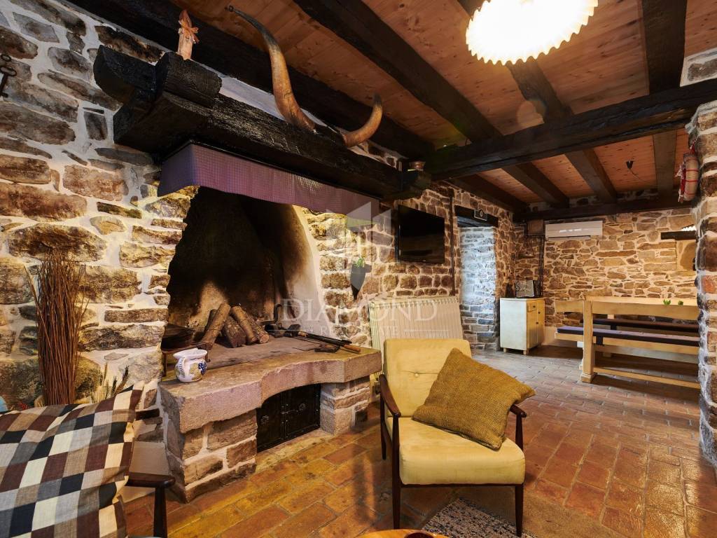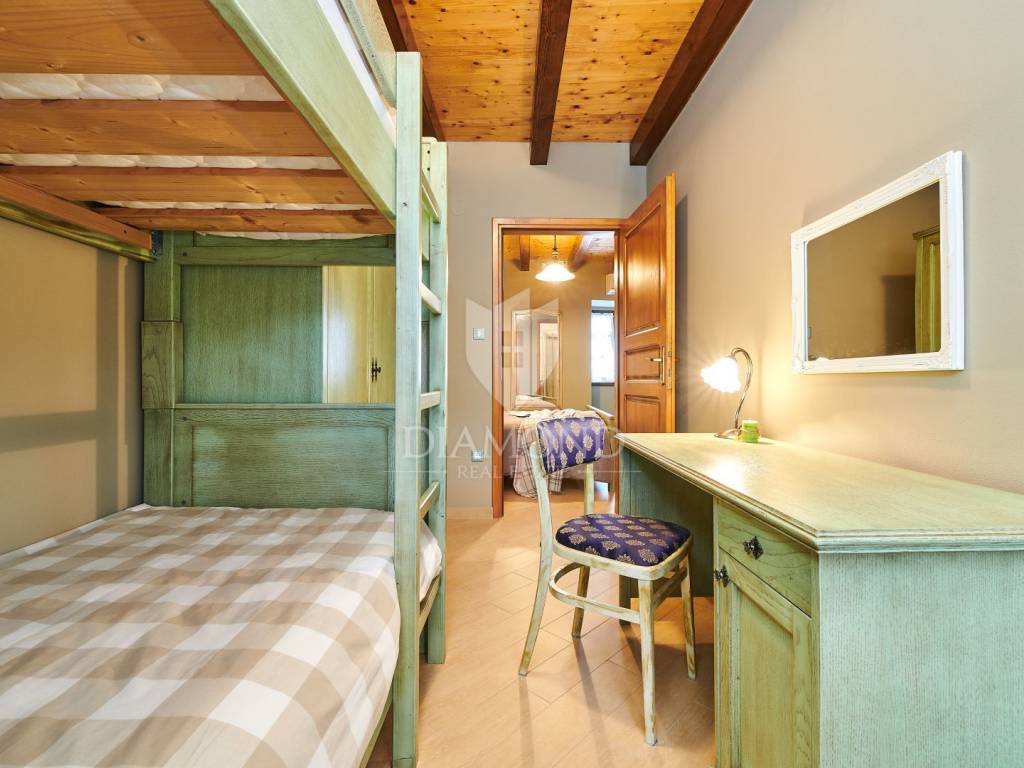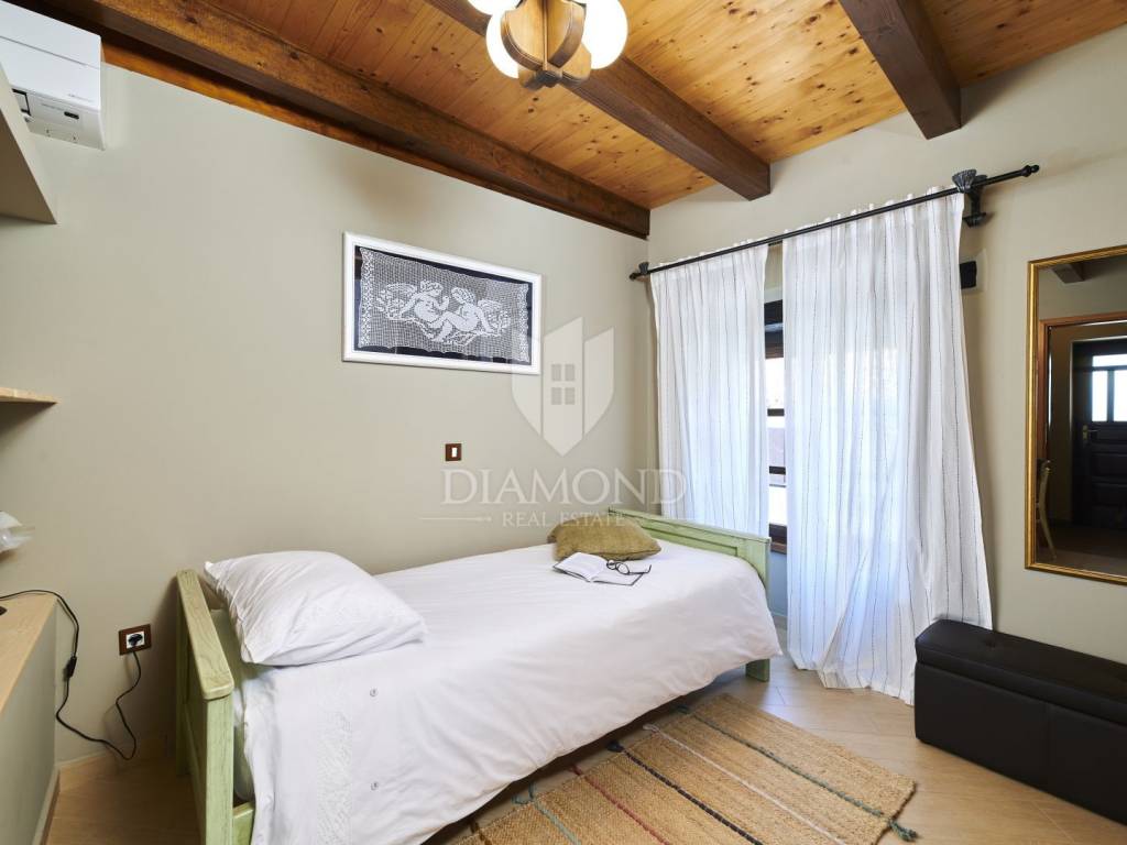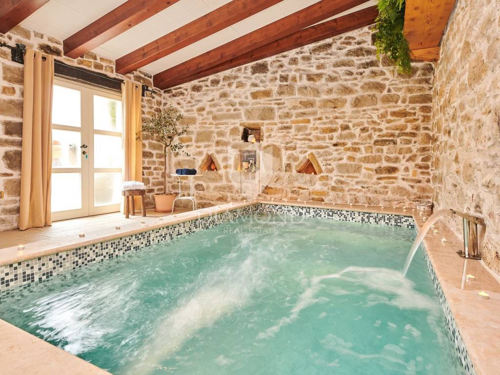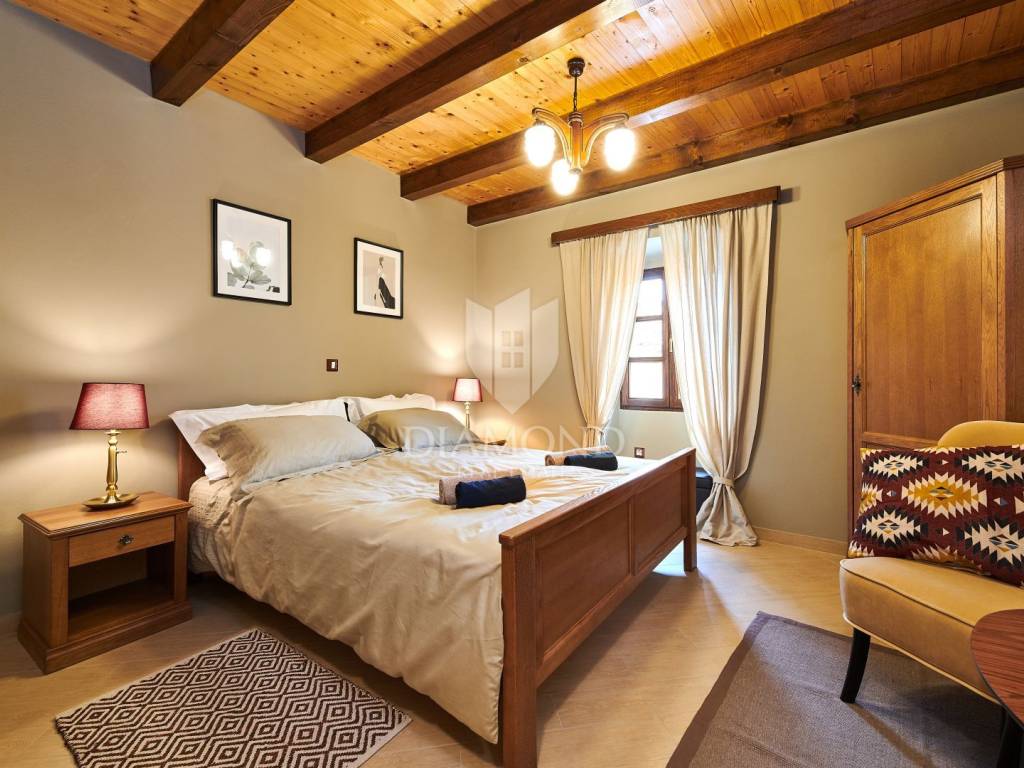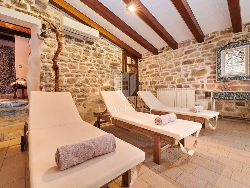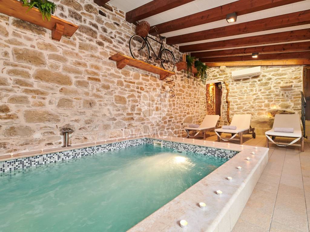 Ova predivna kuća u potpunosti je renovirana s iznimnim osjećajem za detalj i sklad između tradicionalne arhitekture i modernih potreba. U prizemlju se nalazi dnevni boravak s autentičnim ognjištem koji odiše toplinom i karakterom, kuhinja s blagovaonicom, gostinjski toalet te unutarnji bazen sa SPA zonom – pravi kutak za opuštanje tijekom cijele godine. Na katu su tri spavaće sobe, uključujući prostranu „family“ sobu s dodatnim ležajem, te tri elegantne kupaonice.