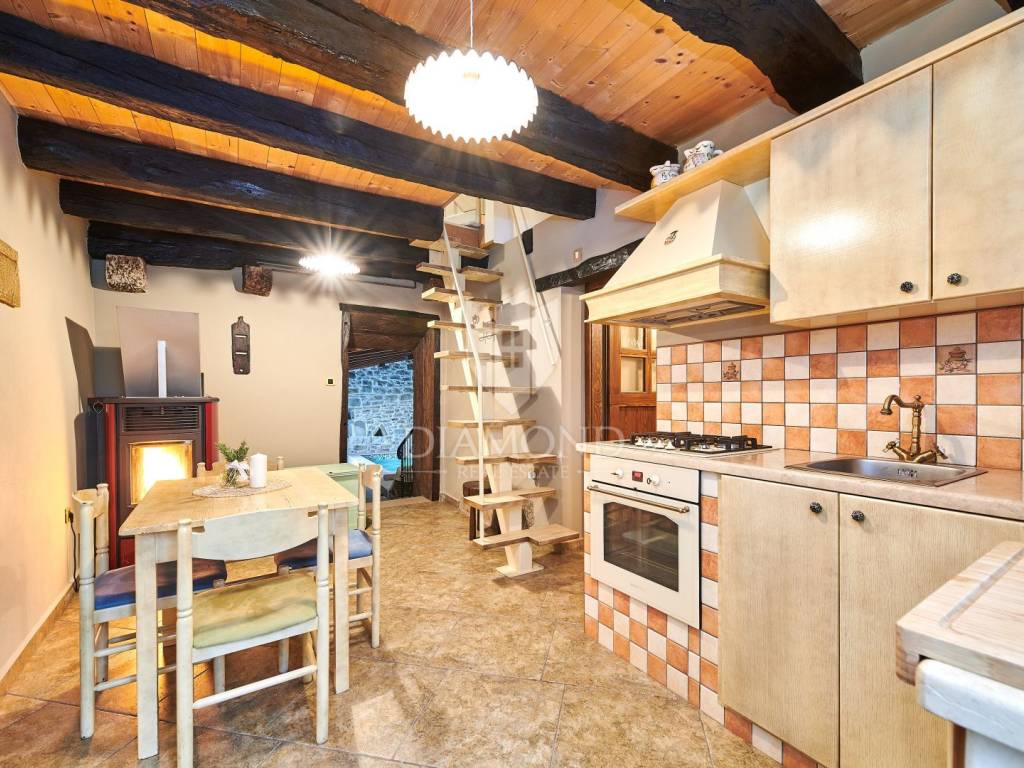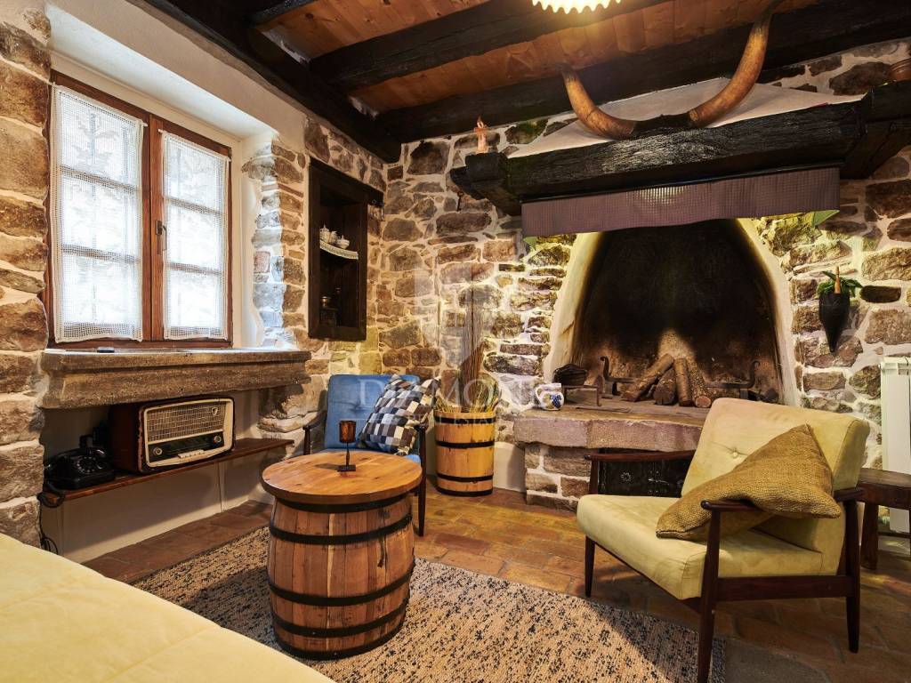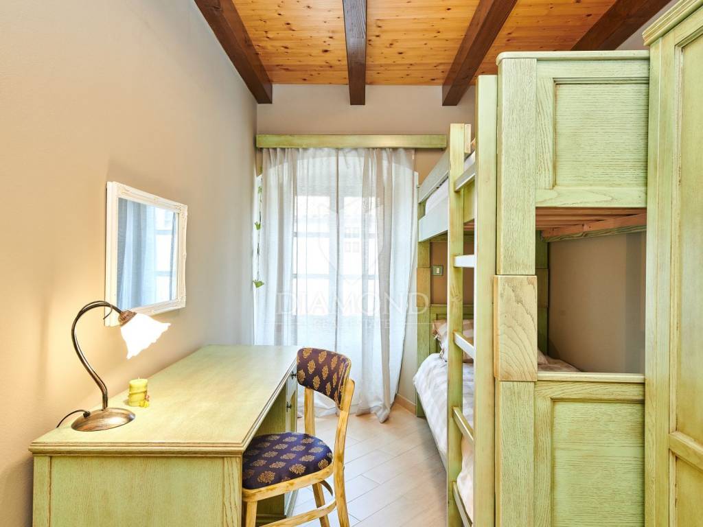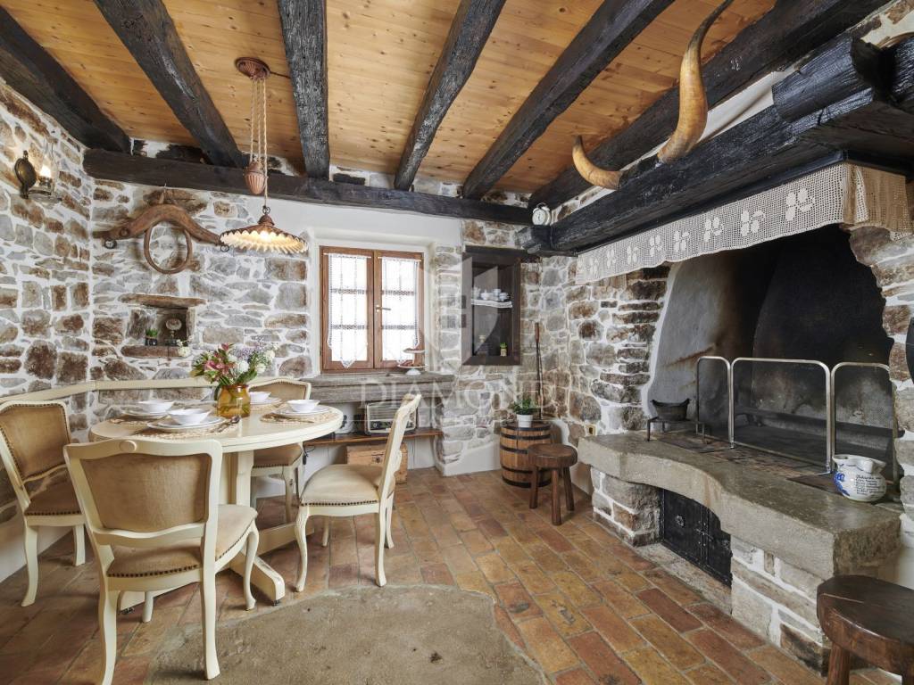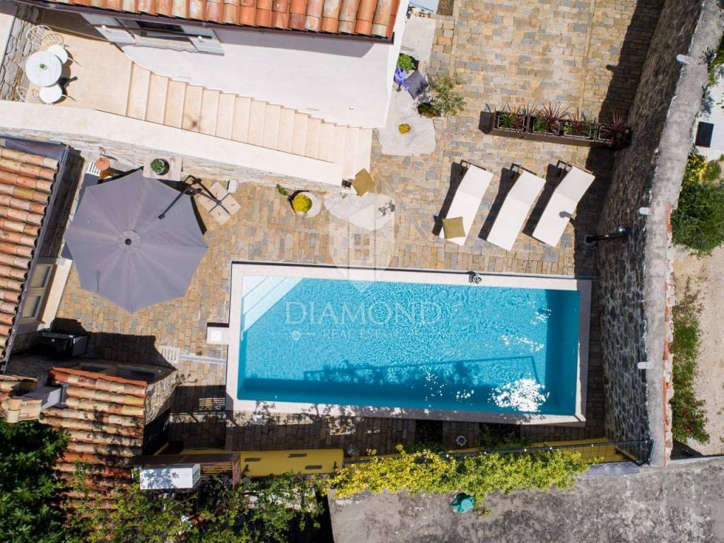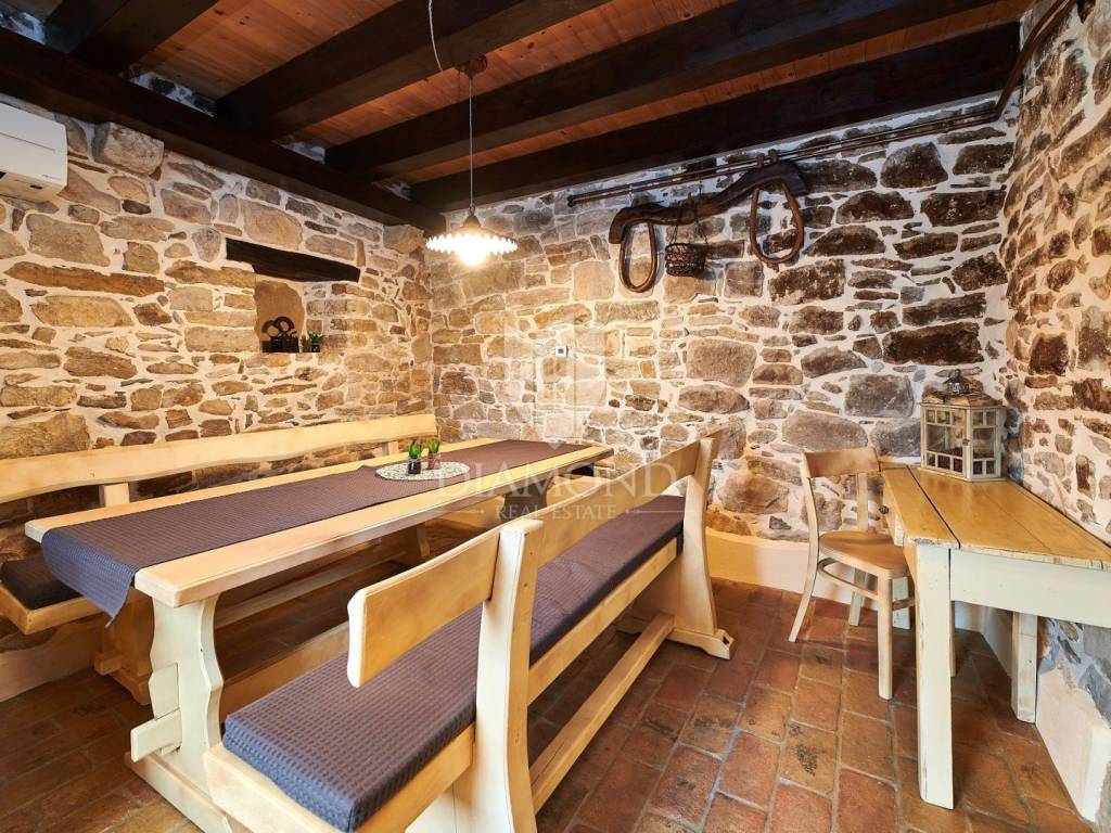 Ova predivna kuća u potpunosti je renovirana s iznimnim osjećajem za detalj i sklad između tradicionalne arhitekture i modernih potreba. U prizemlju se nalazi dnevni boravak s autentičnim ognjištem koji odiše toplinom i karakterom, kuhinja s blagovaonicom, gostinjski toalet te unutarnji bazen sa SPA zonom – pravi kutak za opuštanje tijekom cijele godine. Na katu su tri spavaće sobe, uključujući prostranu „family“ sobu s dodatnim ležajem, te tri elegantne kupaonice.