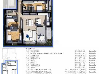 Nalazi se na drugom katu prekrasne novogradnje savršeno uklopljene u okruženje. Stan se sastoji od tri spavaće sobe od kojih je jedna master spavaća soba sa vlastitom kupaonicom, komfornog dnevnog boravka sa blagovaonicom i kuhinjom, kupaonice te natkrivene terase.