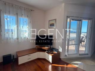 Iznajmljuje se penthouse smješten na trećem katu zgrade prvi redu od mora, na atraktivnoj lokaciji na Žnjanu. Penthouse je idealan za parove, obitelji i poslovne najmoprimce koji traže vrhunsku lokaciju i ugodan životni prostor uz more. Nekretnina ima ukupnu neto površinu od 80 m², uz dodatnih 123m² balkona, te se sastoji od velikog dnevnog boravka povezanog s kuhinjom i blagovaonicom, dvije spavaće sobe, te jedne kupaonice. Svaka soba ima vlastiti izlaz na balkon, što dodatno doprinosi osjećaju prozračnosti, privatnosti te izravne povezanosti s vanjskim prostorom. Zahvaljujući orijentaciji na tri strane svijeta, stan je izuzetno svijetao tijekom cijelog dana te pruža panoramski pogled na more i okolne otoke. Stan je opremljen klima uređajima u dnevnom boravku i hodniku, kao i perilicom posuđa i perilicom rublja, što osigurava visoku razinu komfora i praktičnosti za svakodnevni boravak. Uz penthouse je osigurano jedno garažno, te jedno vanjsko parkirno mjesto. Nekretnina se nalazi na Žnjanu, na lokaciji koja nudi izvrsnu povezanost s ostatkom grada. U neposrednoj blizini dostupni su svi važni sadržaji poput trgovina, škola, parkova i javnog prijevoza, dok su more i plaža udaljeni svega jednu minutu hoda. Stan je dostupan odmah za dugoročni najam. Mjesečna cijena najma iznosi 2.200 EUR, uz dodatno plaćanje režijskih troškova u okvirnom iznosu od 150 EUR.
