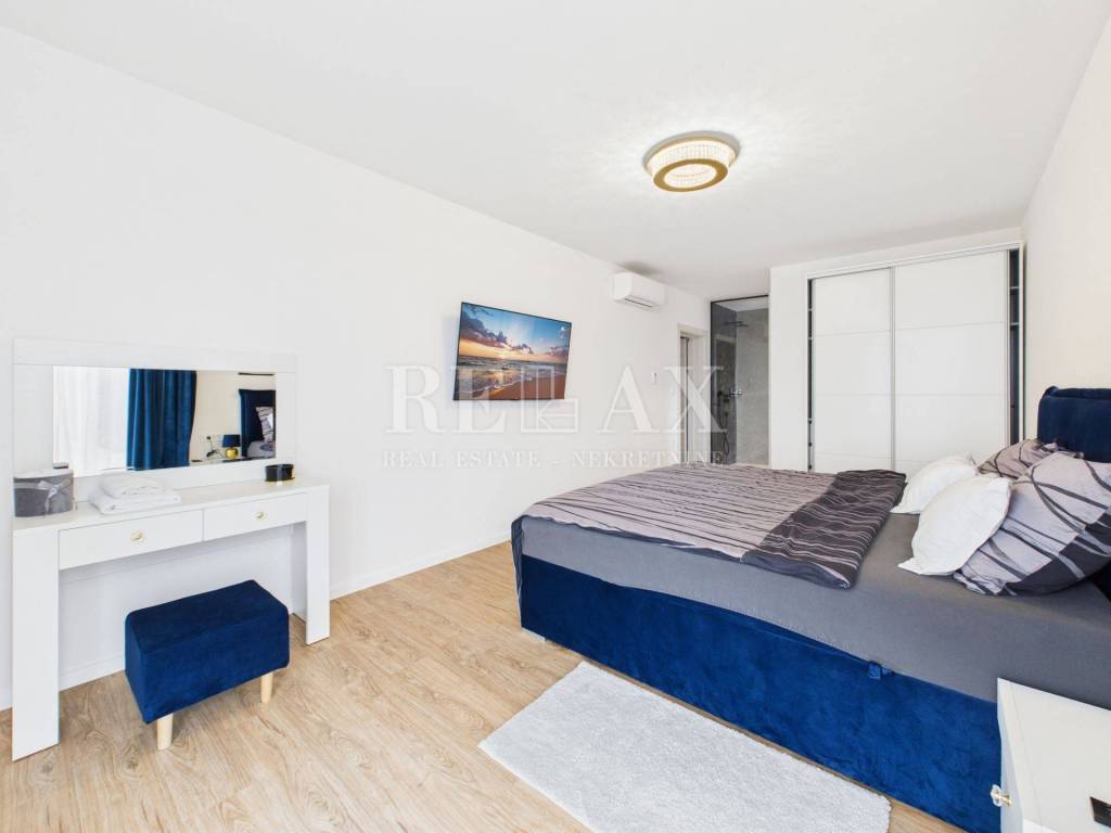 Na katu se nalaze četiri luksuzno uređene spavaće sobe, svaka s vlastitom kupaonicom i izravnim pogledom na more. Dodatni komfor osigurava i zaseban prostor za vešeraj. Sve prostorije opremljene su električnim roletama, dok aluminijska stolarija, sustav video nadzora i alarmni sustav osiguravaju visoku razinu sigurnosti.