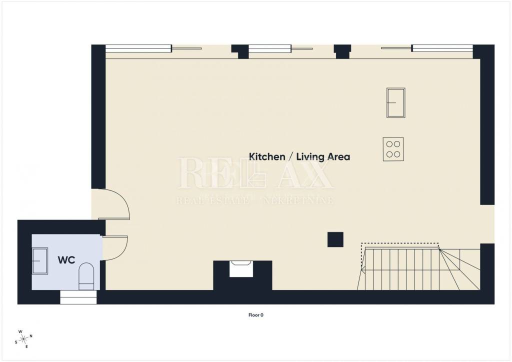 U prizemlju se nalazi prostrani open space dnevni boravak s kaminom, kuhinja s blagovaonicom, zaseban toalet, spremište, prostor za fitness te soba sa saunom. Velike staklene stijene povezuju interijer s vanjskim dijelom vile, omogućujući obilje prirodnog svjetla i neometan pogled na more.
