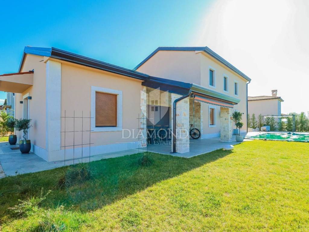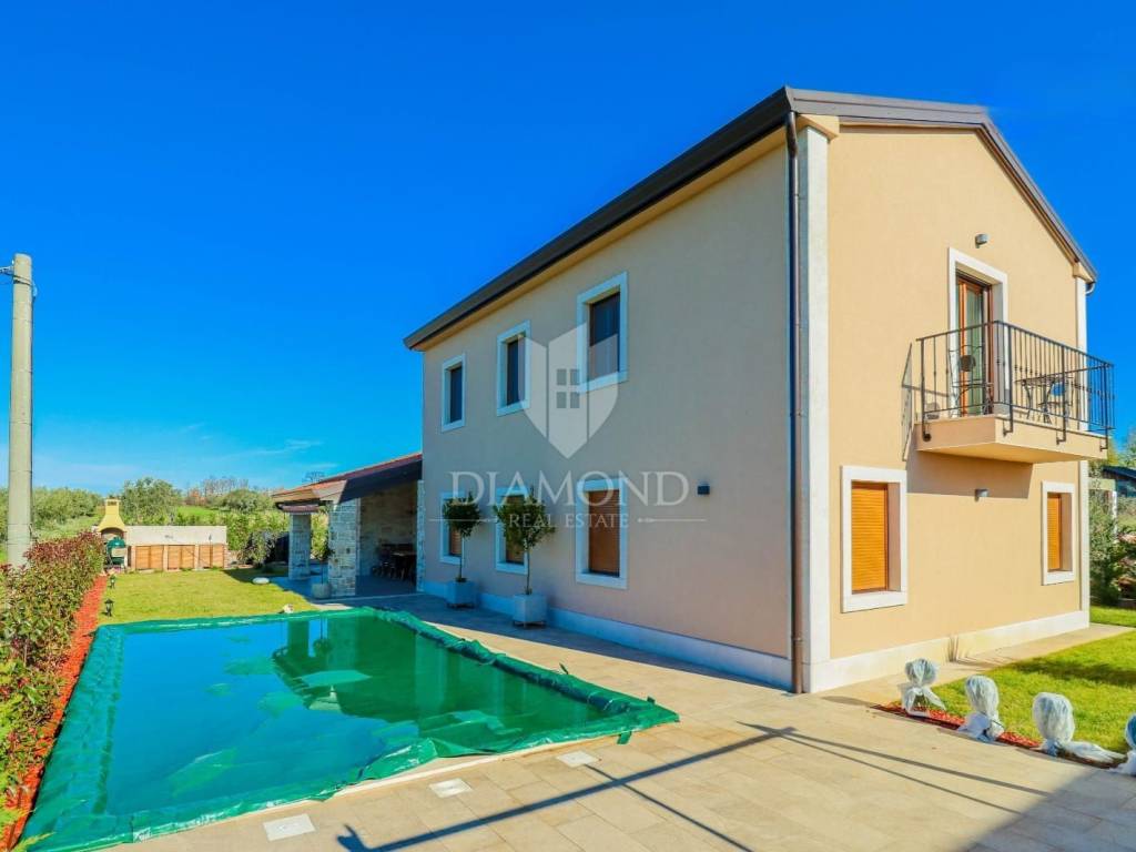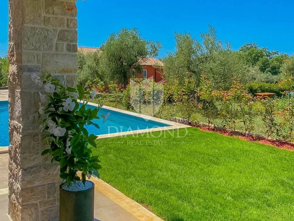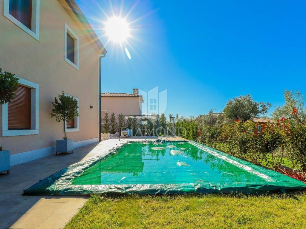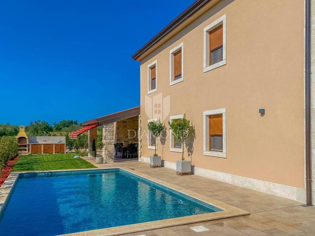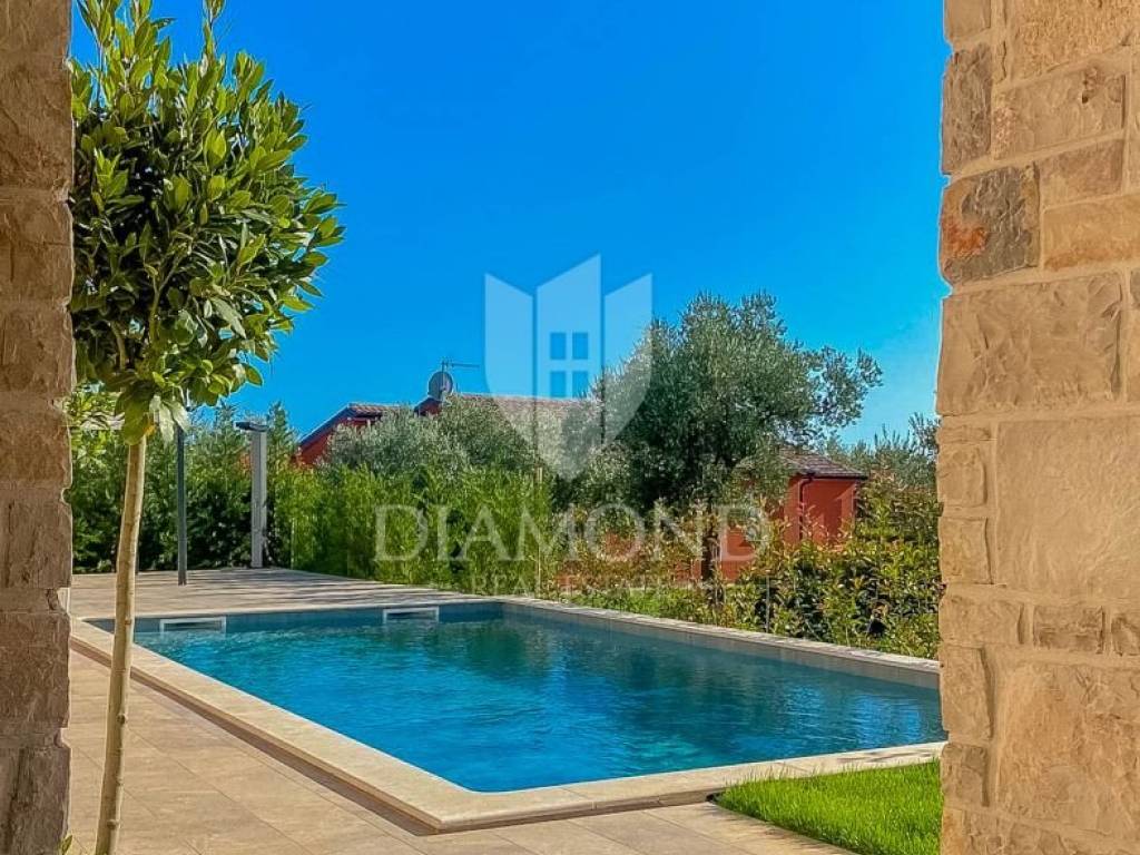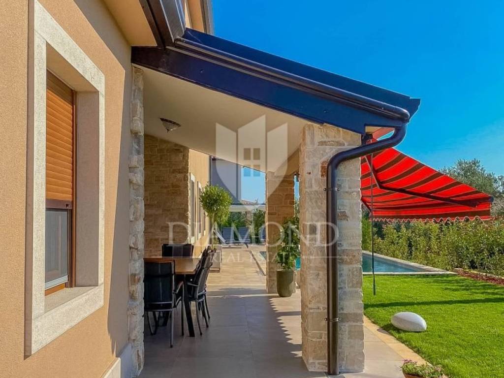 Vila je smještena na zemljištu površine 859 m2. Ukupna površina vile iznosi 194 m2 a proteže se na dvije etaže. U prizemlju ove prekrasne vile nalazi se veliki dnevni boravak sa kuhinjom i blagovaonicom otvorenog tipa, 2 spavaće sobe, 2 kupaonice, tehnička soba i hodnik. Iz dnevnog boravka se izlazi na natkrivenu terasu sa koje se pristupa uređenoj okućnici na kojoj je smještena ljetna kuhinja sa kaminom, prekrasni bazen površine 32 m2 sa sunčalištem i parkiralište. Na kat se pristupa unutarnjim stepenicama od drva gdje su smještene još 2 spavaće sobe svaka sa svojom vlastitom kupaonicom, od kojih je jedna master spavaća soba sa garderobom i terasom sa pogledom na more. Villa je građena od vrhunskih materijala u Istarskom stilu sa visokim stropovima i detaljima od kamena i drva. Grijanje je podno na struju a hlađenje na klima uređaje.