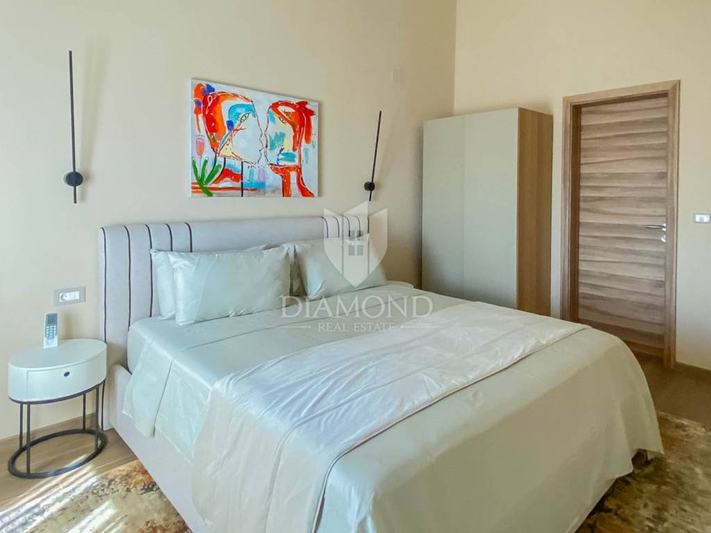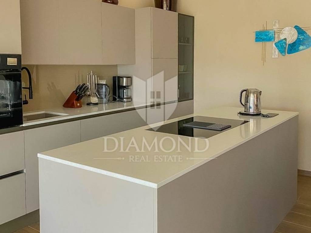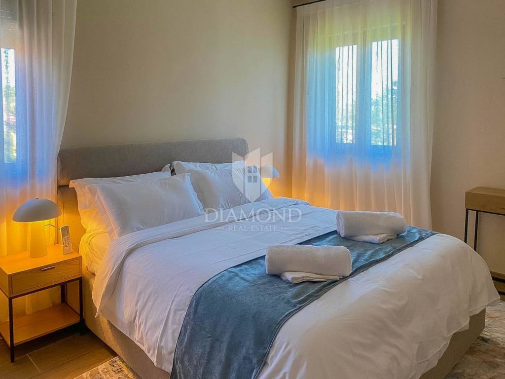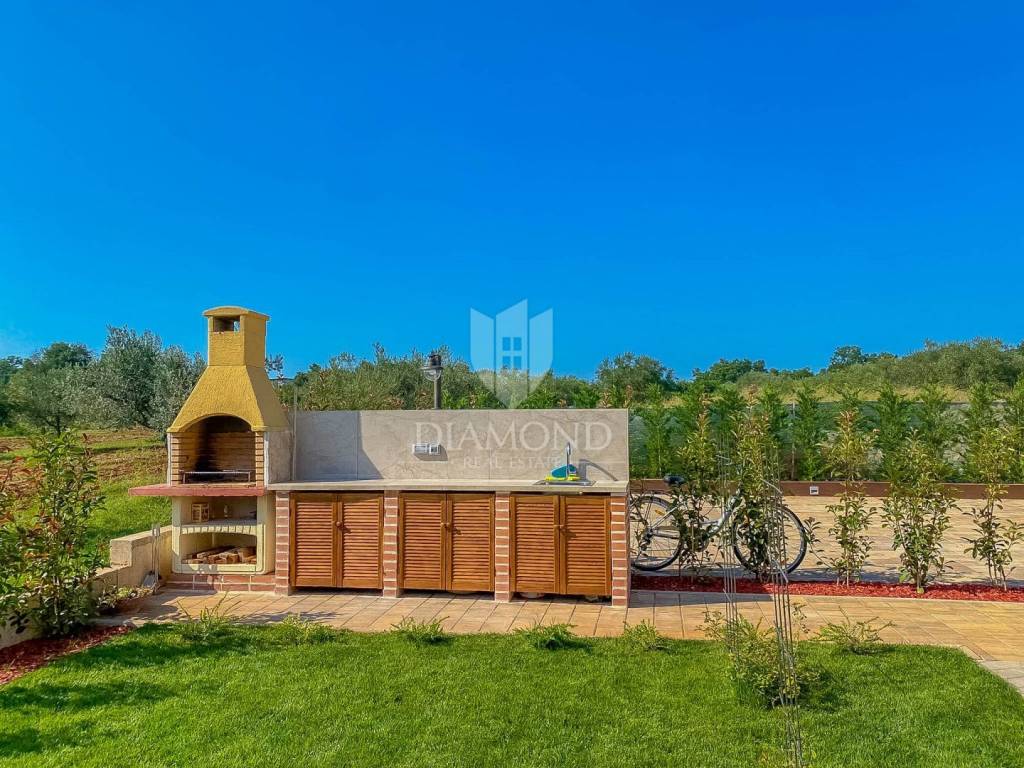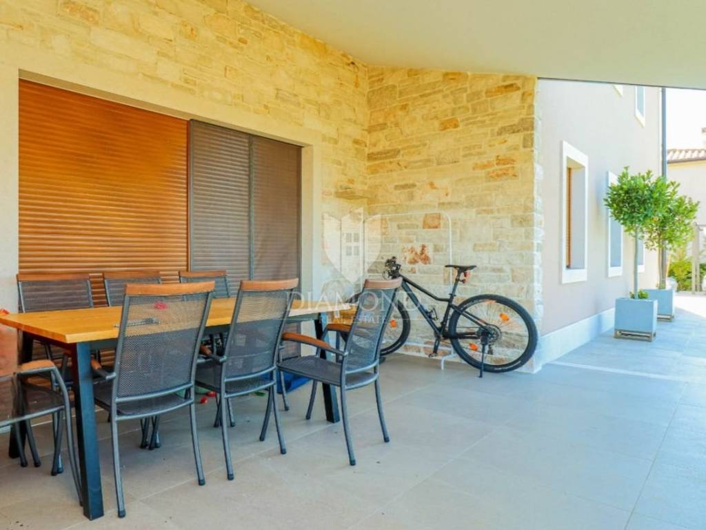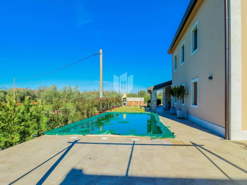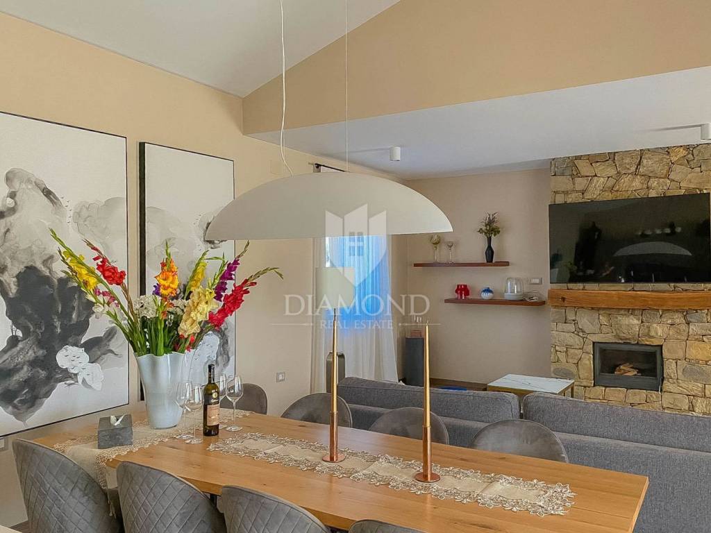 Vila je smještena na zemljištu površine 859 m2. Ukupna površina vile iznosi 194 m2 a proteže se na dvije etaže. U prizemlju ove prekrasne vile nalazi se veliki dnevni boravak sa kuhinjom i blagovaonicom otvorenog tipa, 2 spavaće sobe, 2 kupaonice, tehnička soba i hodnik. Iz dnevnog boravka se izlazi na natkrivenu terasu sa koje se pristupa uređenoj okućnici na kojoj je smještena ljetna kuhinja sa kaminom, prekrasni bazen površine 32 m2 sa sunčalištem i parkiralište. Na kat se pristupa unutarnjim stepenicama od drva gdje su smještene još 2 spavaće sobe svaka sa svojom vlastitom kupaonicom, od kojih je jedna master spavaća soba sa garderobom i terasom sa pogledom na more. Villa je građena od vrhunskih materijala u Istarskom stilu sa visokim stropovima i detaljima od kamena i drva. Grijanje je podno na struju a hlađenje na klima uređaje.
