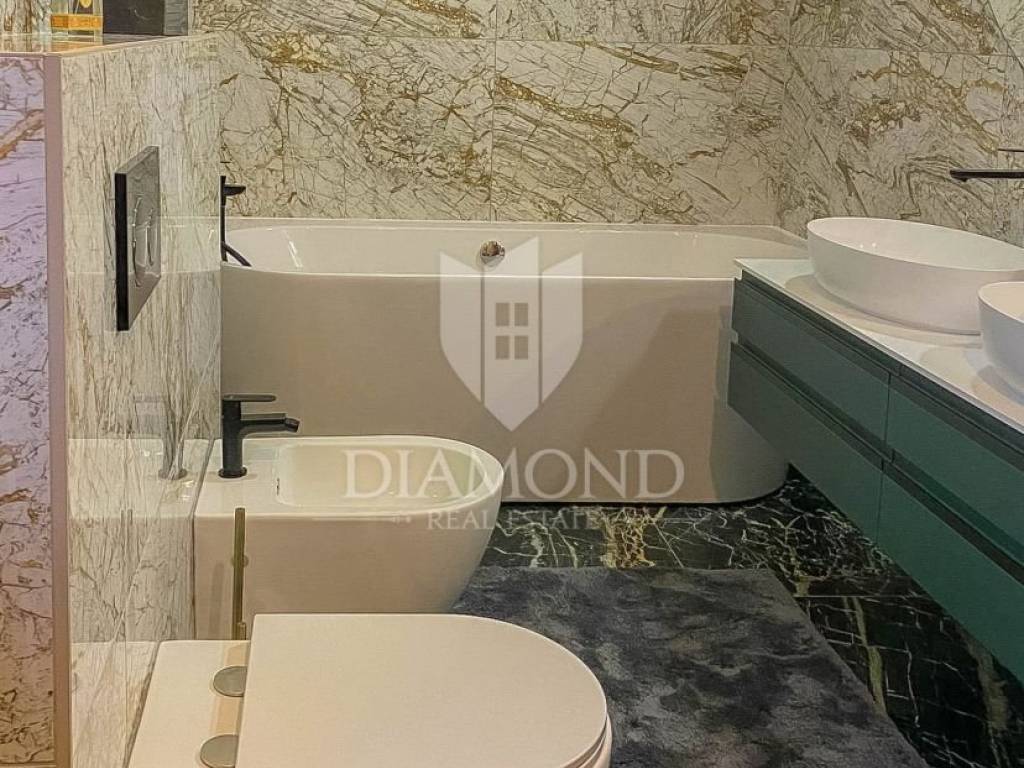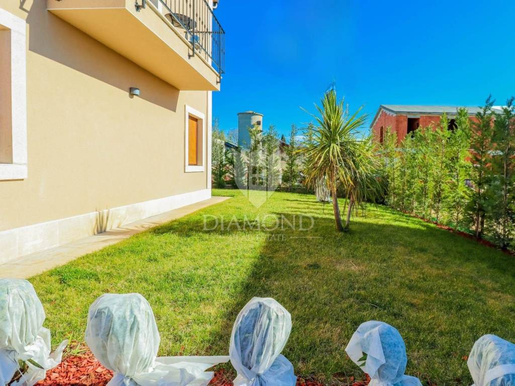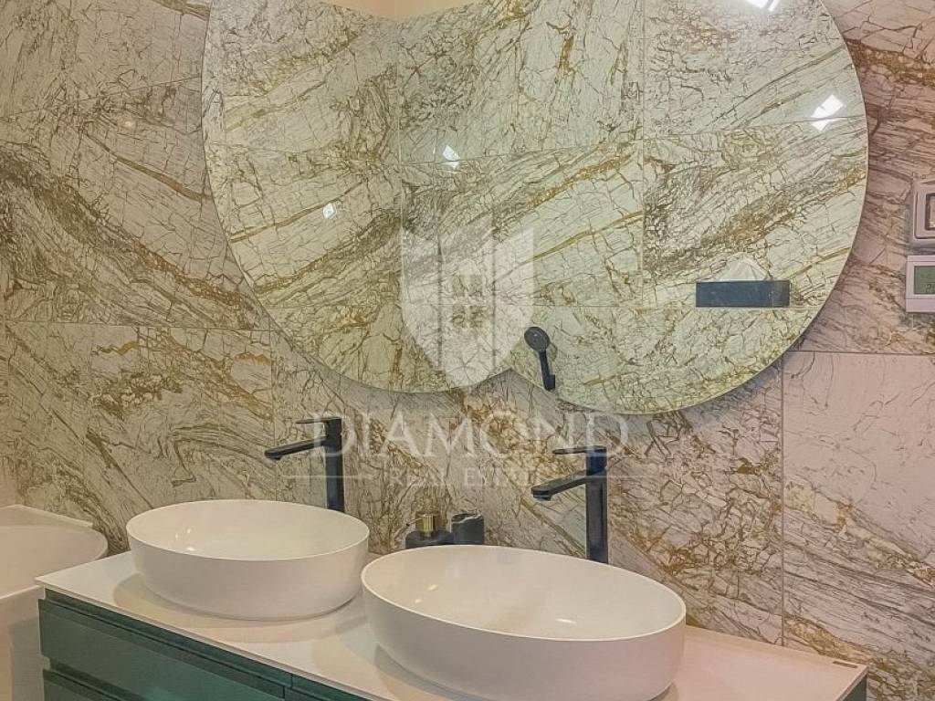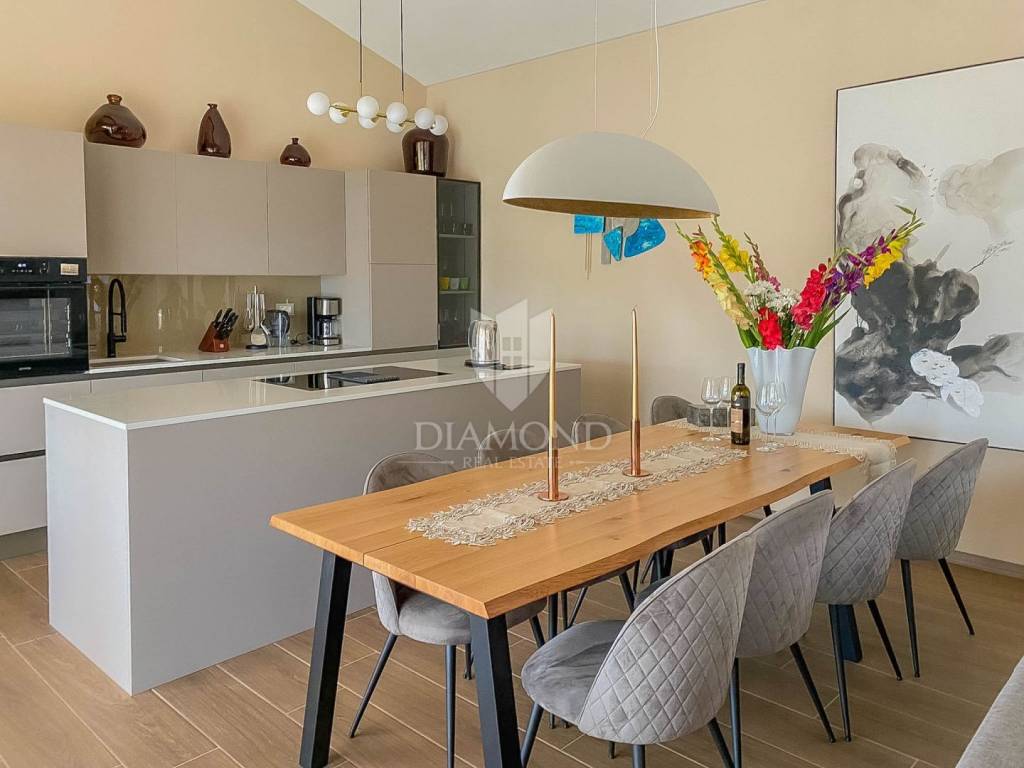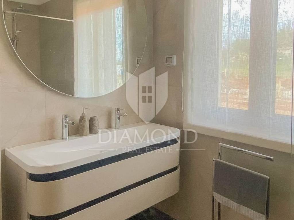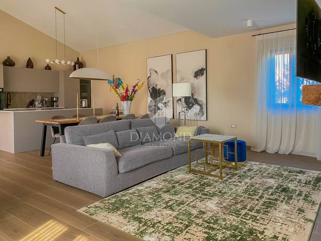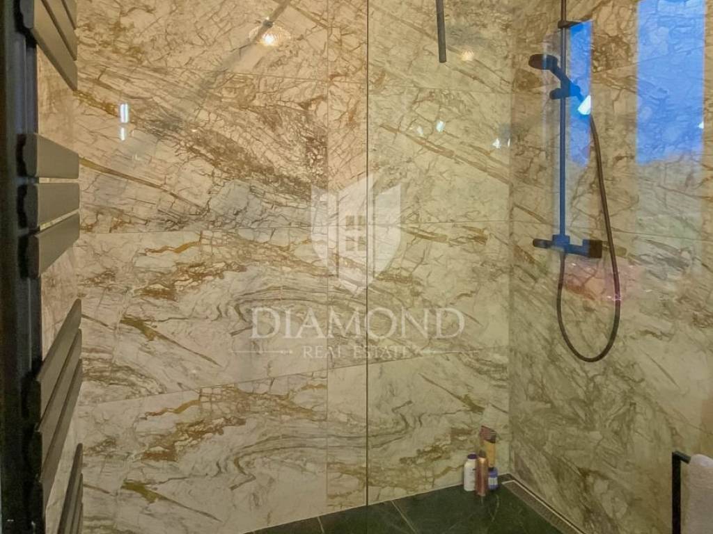 Vila je smještena na zemljištu površine 859 m2. Ukupna površina vile iznosi 194 m2 a proteže se na dvije etaže. U prizemlju ove prekrasne vile nalazi se veliki dnevni boravak sa kuhinjom i blagovaonicom otvorenog tipa, 2 spavaće sobe, 2 kupaonice, tehnička soba i hodnik. Iz dnevnog boravka se izlazi na natkrivenu terasu sa koje se pristupa uređenoj okućnici na kojoj je smještena ljetna kuhinja sa kaminom, prekrasni bazen površine 32 m2 sa sunčalištem i parkiralište. Na kat se pristupa unutarnjim stepenicama od drva gdje su smještene još 2 spavaće sobe svaka sa svojom vlastitom kupaonicom, od kojih je jedna master spavaća soba sa garderobom i terasom sa pogledom na more. Villa je građena od vrhunskih materijala u Istarskom stilu sa visokim stropovima i detaljima od kamena i drva. Grijanje je podno na struju a hlađenje na klima uređaje.