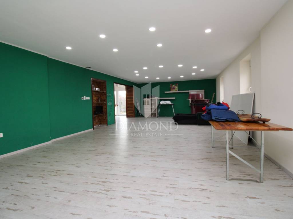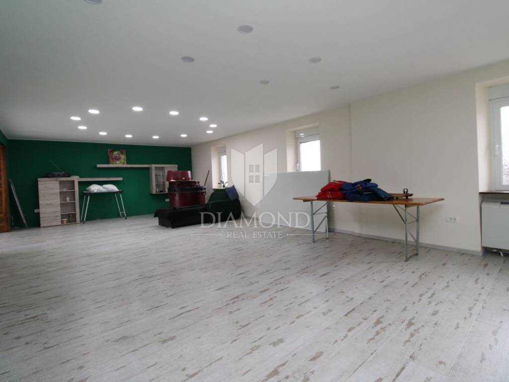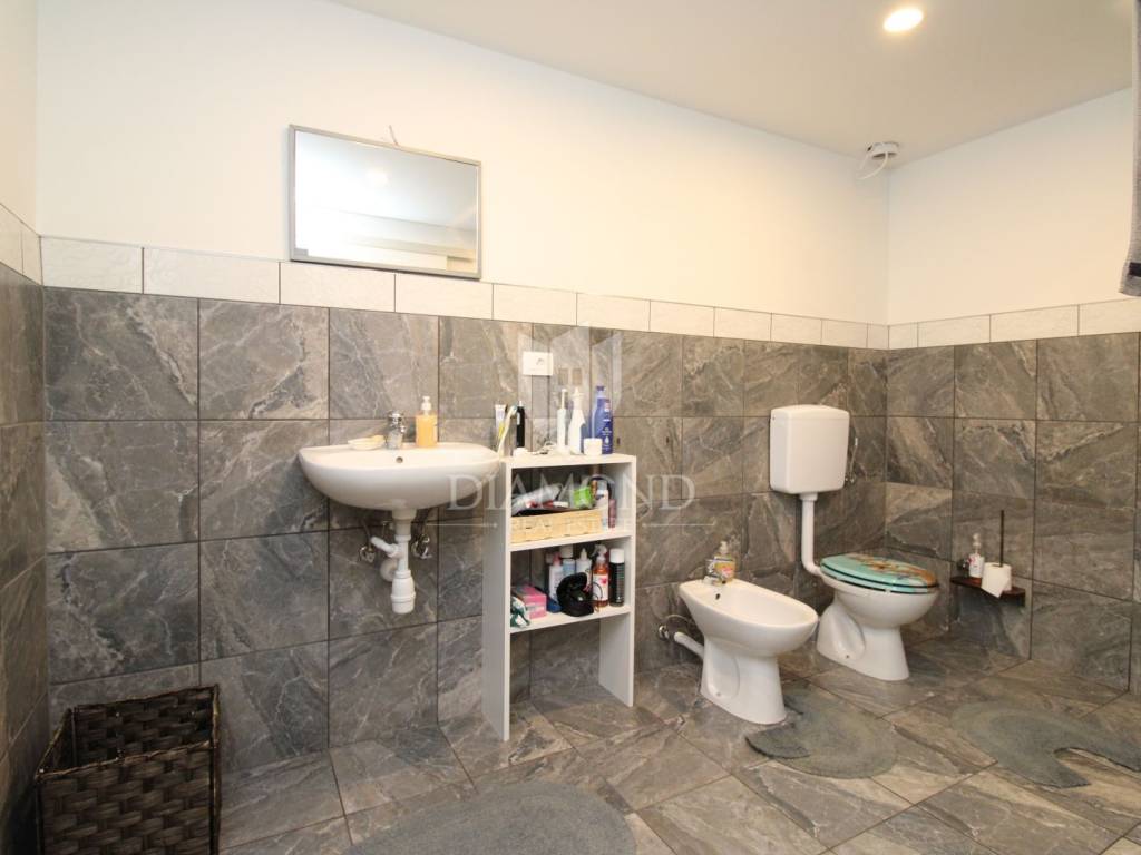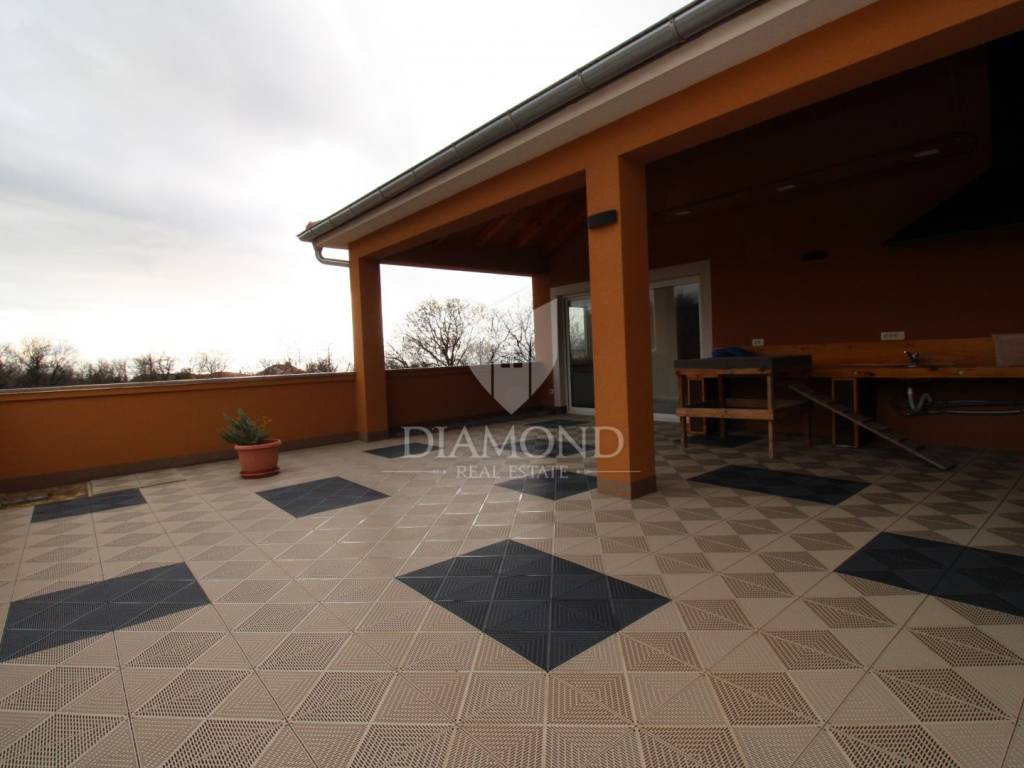 Na katu se nalazi ogroman dnevni boravak od 50 m² s izlazom na prekrasnu terasu od 60 m², koja vodi na još jednu terasu iste veličine. Tu su i moderna kuhinja te spavaća soba s privatnom kupaonicom i WC-om.