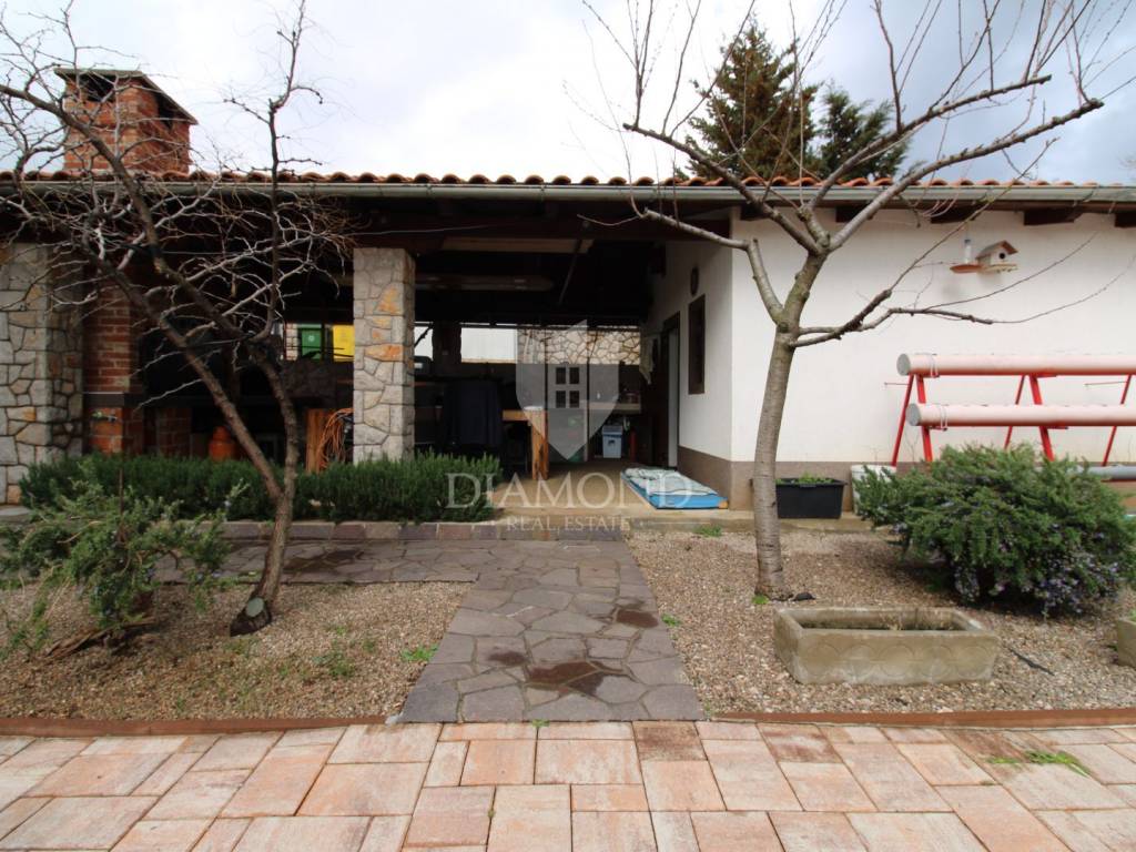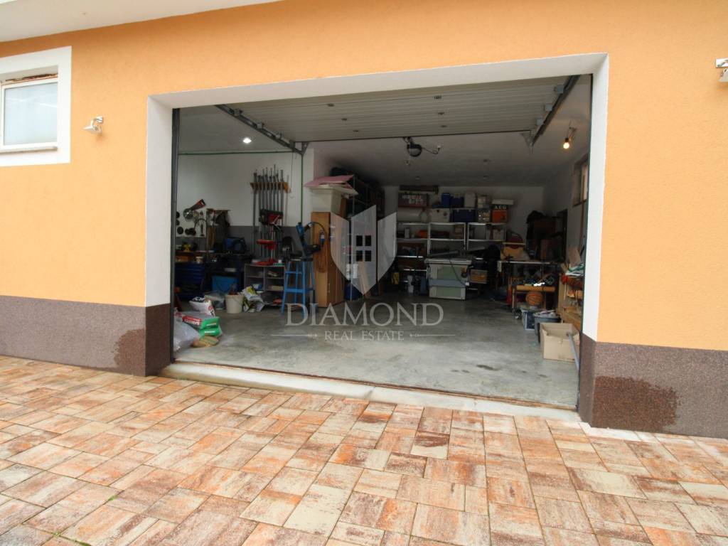 Okućnica se prostire na 1.420 m² i nudi sve što je potrebno za vrhunski komfor. U dvorištu se nalaze velika garaža, bazen dimenzija 9x5 m te prekrasna konoba s velikim kaminom, idealna za druženja. Cijela okućnica je ograđena, a automatska kapija osigurava privatnost i sigurnost. Ispod kuće se nalazi veliki podrum koji pruža dodatni prostor za pohranu.