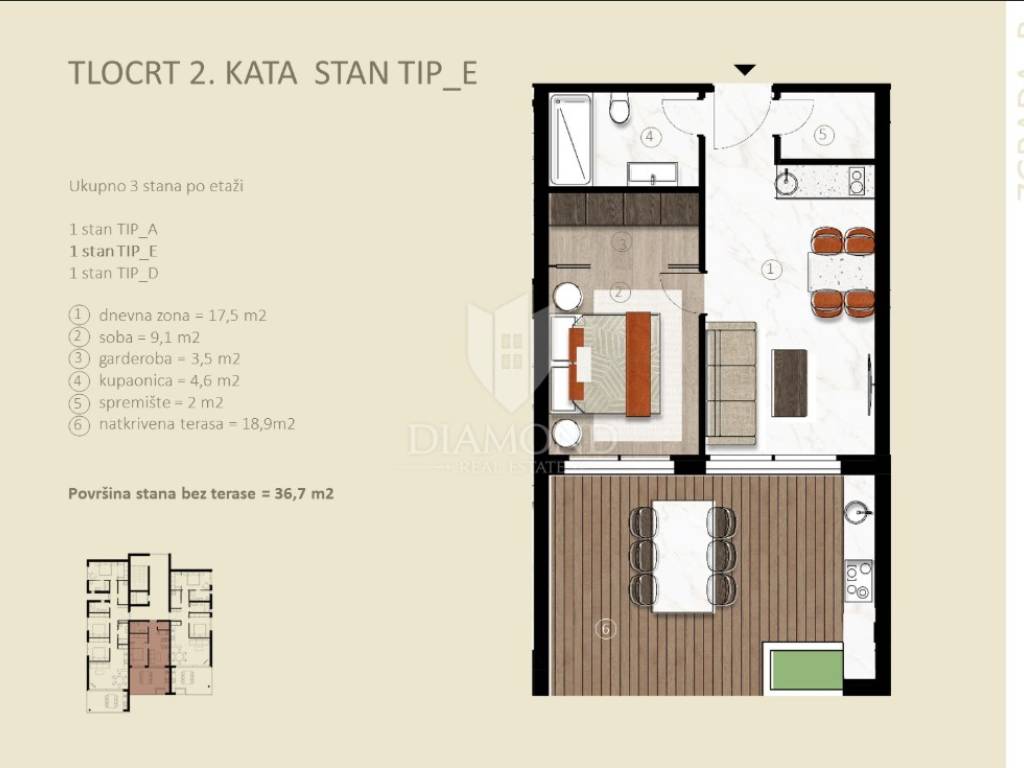 Ovaj prekrasan apartman u svojih 47m2 nudi prostrani dnevni boravak koji se sastoji od kuhinje, blagovaonice i udobnog dnevnog boravka, stvarajući savršeno mjesto za druženje i opuštanje. Dodatno, apartman ima jednu spavaću sobu sa svojom kupaonicom za dodatnu privatnost i udobnost. Iz dnevnog boravka se izlazi na prekrasnu veliku natkrivenu terasu s ljetnom kuhinjom, idealnu za uživanje na svježem zraku i opuštanje na otvorenom. Apartman se može pohvaliti i prekrasnom terasom od ukupno 39m2, pravim rajem za one koji vole provoditi vrijeme na otvorenom. Stan također uključuje parkirno mjesto i dodatno spremište, čime se osigurava udobnost i sigurnost za sve stanare. Podno grijanje, klime u svakoj prostoriji za regulaciju temperature i najkvalitetniji materijali čine ovaj projekt posebnim u svakom pogledu. Ovo je doista dom koji nudi sve što vam je potrebno za ugodan i elegantan stil života.