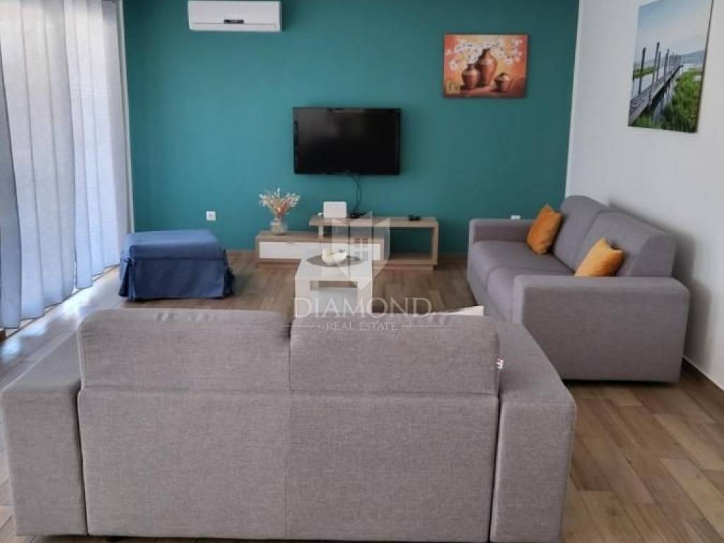 Sama kuća je jako lijepo i smišljeno izgrađena. U prizemlju se nalazi otvoreni koncept sa dnevnom boravkom, kuhinjom i blagovaonicom iz kojih se izlazi na prostranu terasu idealnu za odmaranje i uživanje sa pogledom na more. Tu se nalazi još jedna spavaća soba sa svojom vlastitom kupaonicom te jedna gostinjska kupaonica. Na katu su još dvije spavaće sobe svaka sa svojom kupaonicom dok nam se u podrumu nalazi soba za igranje sa bilijarom.