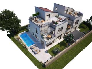 Kuća se gradi na zemljištu od 300m2, ukupne površine 200m2. U prizemlju kuće nalazi se kuhinja i dnevni boravak rađeni po principu open space, 2 spavaće sobe i wc. Na katu kuće se nalaze tri spavaće sobe od kojih svaka ima pogled na more i dvije kupaonice. Što kuću čini posebnom je krovna terasa sa jacuzziem i predivnim pogledom na more. U dvorištu kuće nalazi se bazen, te dva parkirna mjesta. Predviđeno grijanje je etažno podno na dizalicu toplinu a hlađenje na klima uređaje. Kuća se gradi od visoko kvalitetnih materijala te se nudi mogućnost odabira keramike, parketa i sanitarija.