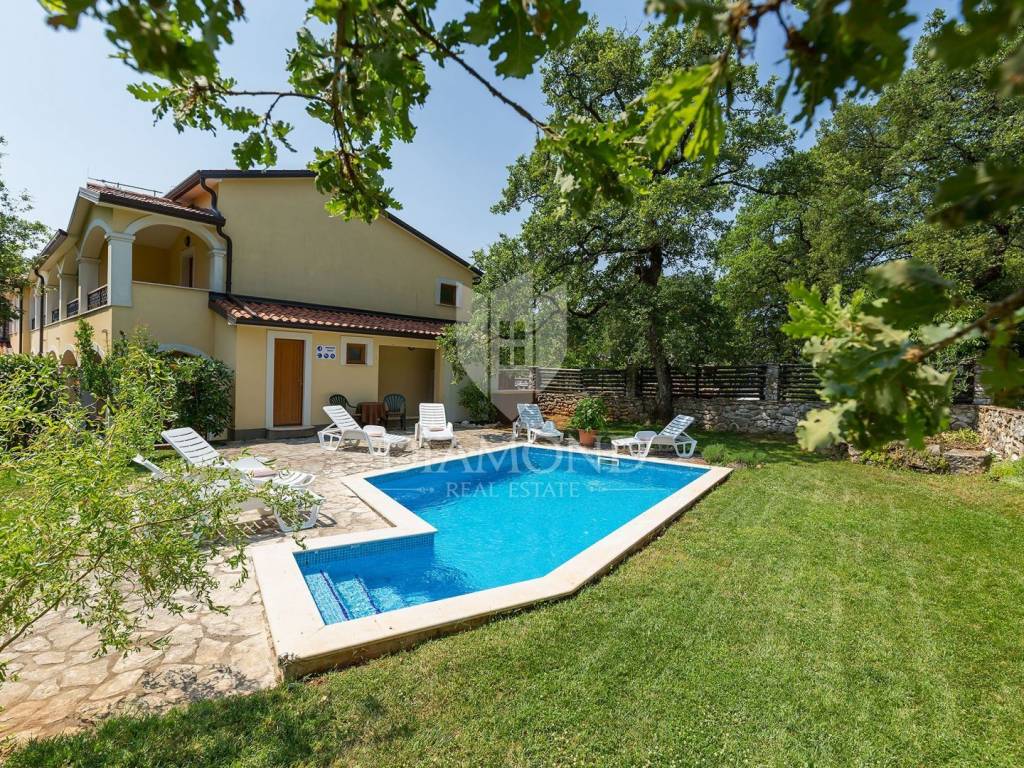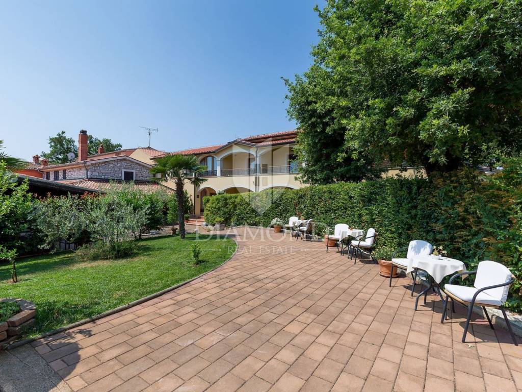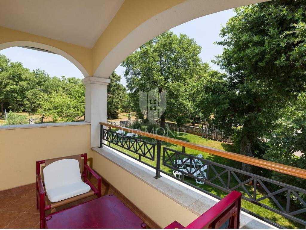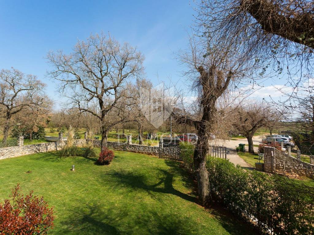 Na katu se nalaze dodatni stan od 170m2 u Roh-bau fazi. Cijela kuća uređena je u tradicionalnom stilu s rustikalnim detaljima koji pružaju autentični doživljaj istarskog zaleđa koje Vas iščekuje za opušten odmor dok ste okruženi prirodom. Opustite se kod bazena, uživajte u suncu na ležaljkama. Djeca se mogu istrčati na igralištu ili zaigrati nogomet dok pripremate jela na roštilju na ugljen u kojima kasnije svi mogu uživati u blagavaonici na otvorenom.