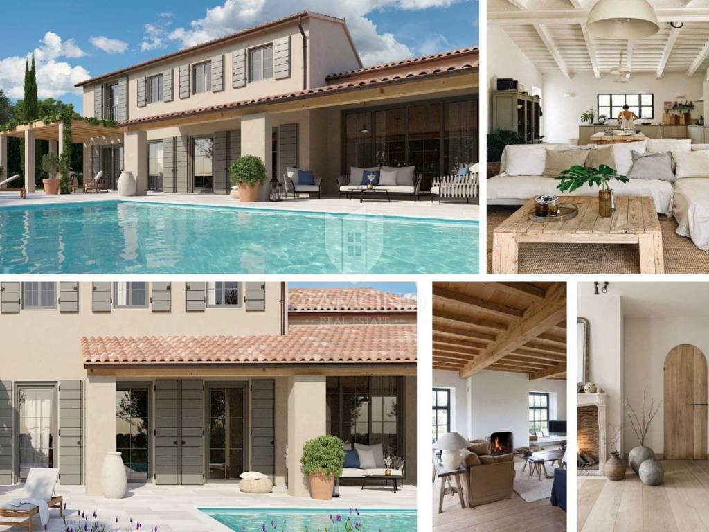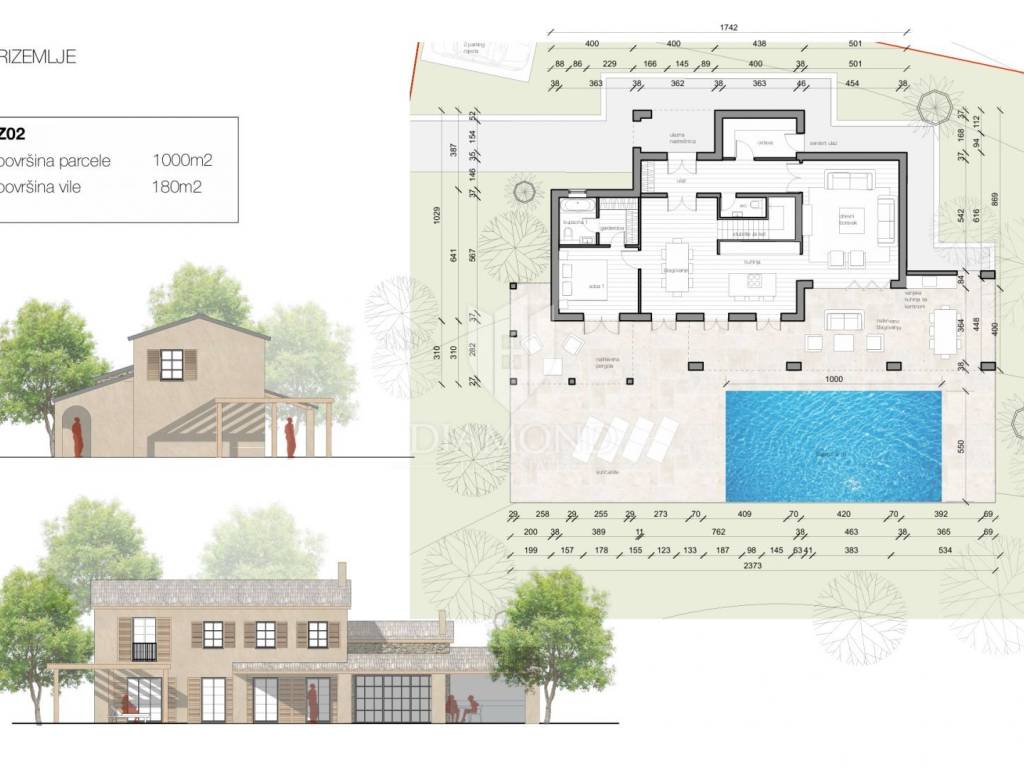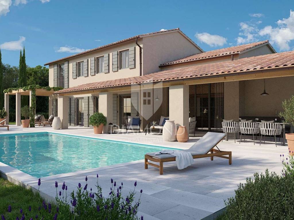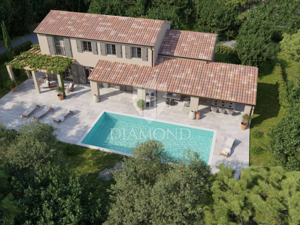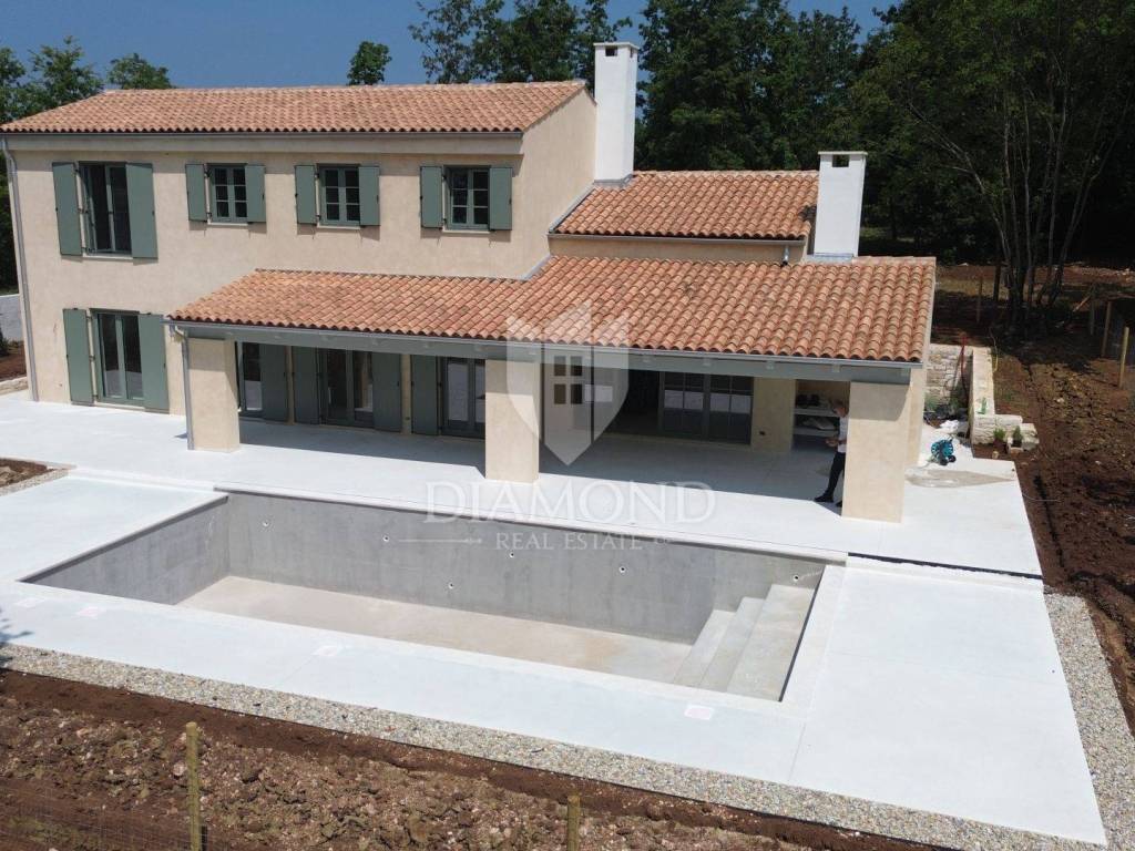 Sama kuća se nalazi na osami i na fantastičnoj parceli okružena šumom i zelenilom. Građena je odličnim materijalima u fantastičnom istarsko modernom stilu. Smjestila se na prostranoj parceli od 1000 kvadrata što pruža intimu i mir. Sama kuća je koncipirana tako da se nakon ulaza sa lijeve strane nalazi veliki dnevni boravak sa visokim stropom u kojem dominira kameni kamin. Pored njega je kuhinja te blagovaonica. Sa desne strane ulaza se nalazi jedna spavaća soba sa kupaonicom te stepenice koje vode na kat gdje su smještene još dvije spavaće sobe svaka sa svojim kupaonicom. U prizemlju se nalazi još jedno gostinjsko kupatilo te ostava.