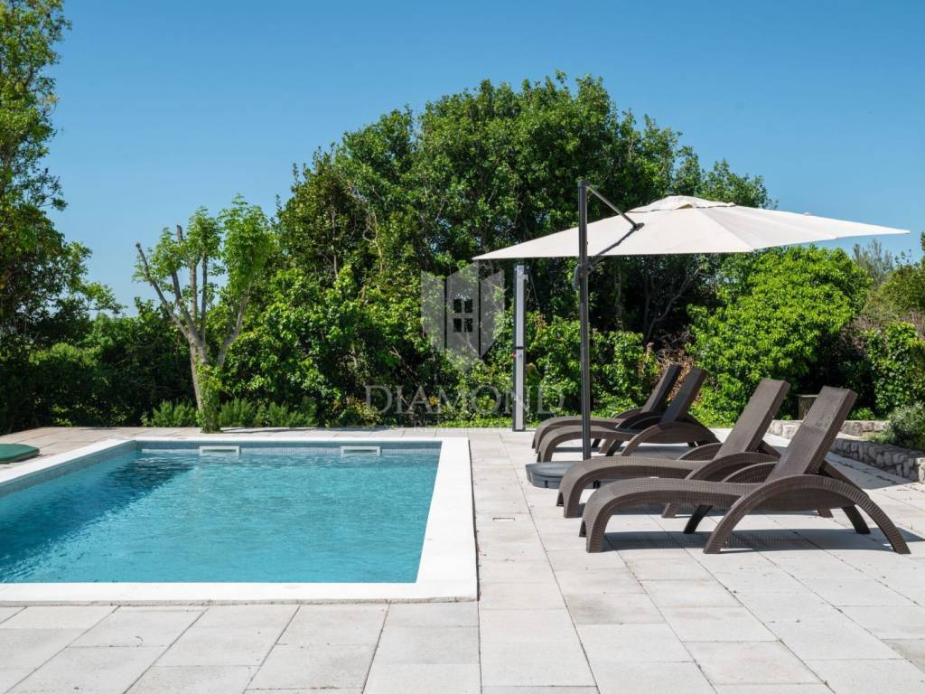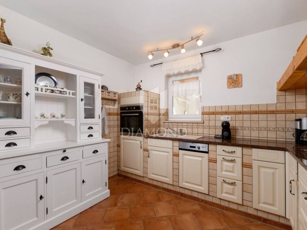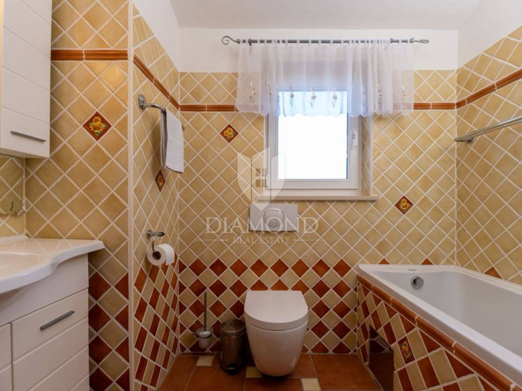 Kuća se prostire kroz dvije etaže i nudi funkcionalan raspored prostorija idealan za obiteljski život ili kao investicija za turistički najam. U potpunosti je namještena i opremljena te spremna za useljenje. S prostrane terase i bazena pruža se prekrasan pogled na more.
