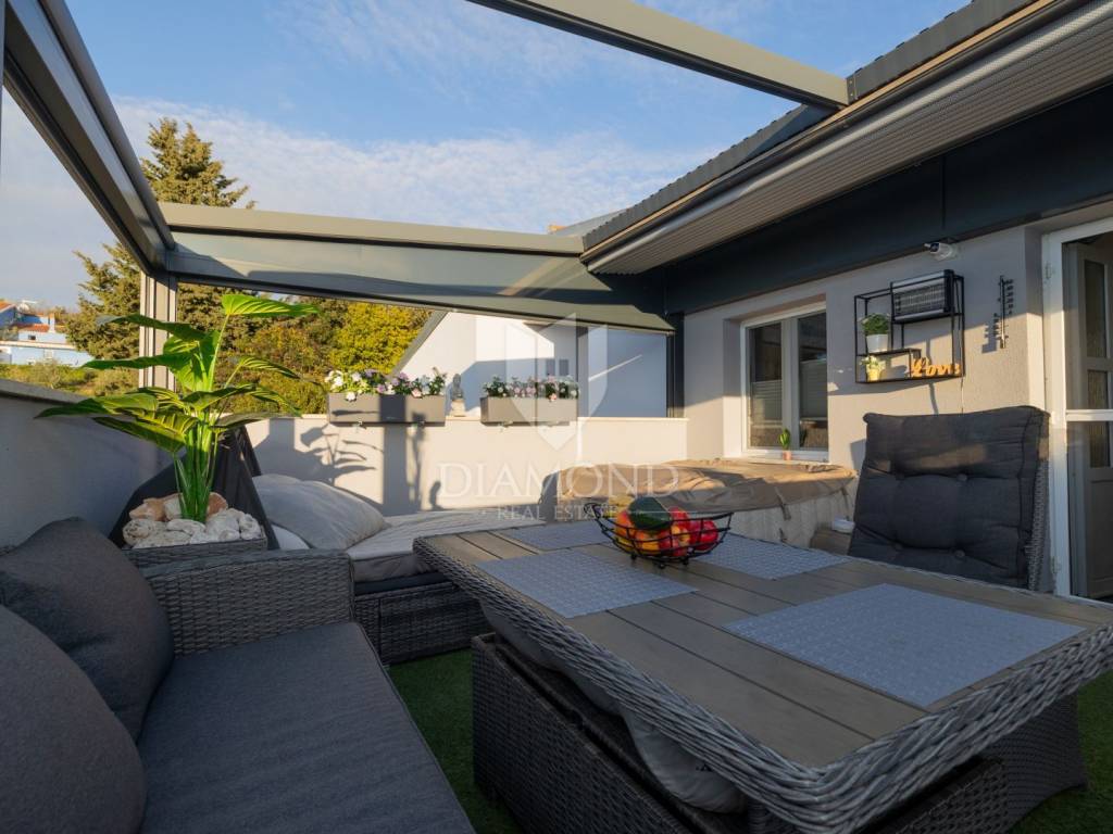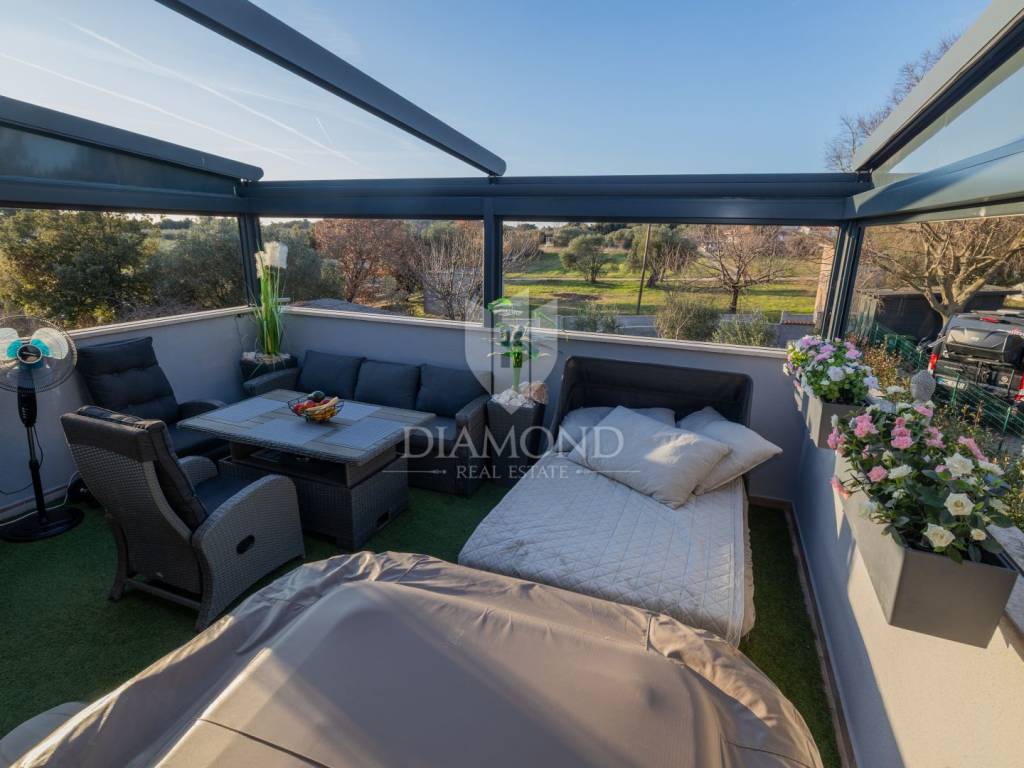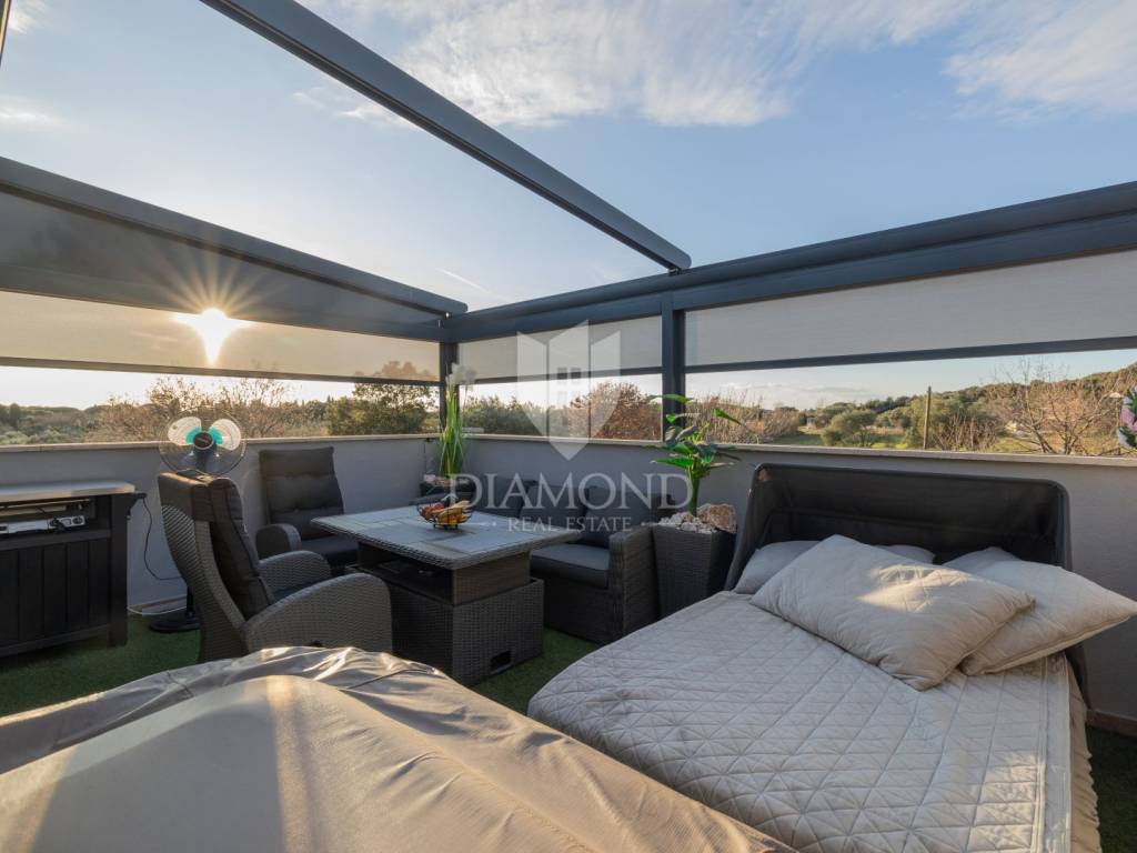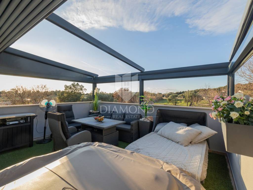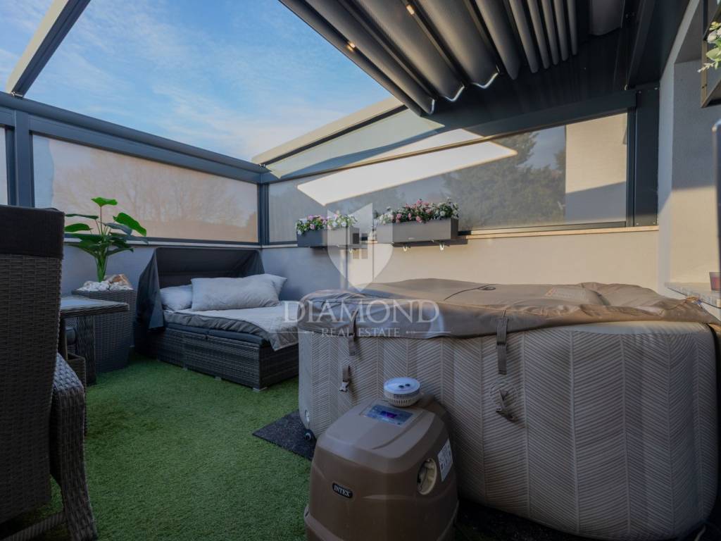 Posebna vrijednost ove nekretnine je prostrana natkrivena terasa površine 20 m², pogodna za boravak tijekom cijele godine, osmišljena kao prava privatna oaza. Terasa je opremljena električnom pergolom s upravljanjem putem pametnog telefona, električnim sjenilima s timerom i daljinskim upravljačem, vanjskom kuhinjom, dizajnerskim vrtnim namještajem te privatnim whirlpoolom (jacuzzijem) koji pruža luksuzno opuštanje u potpunoj privatnosti.