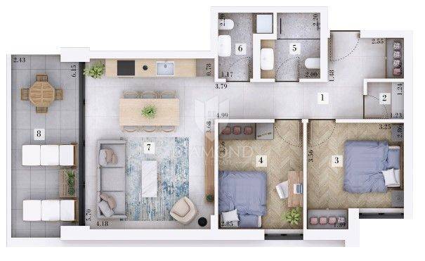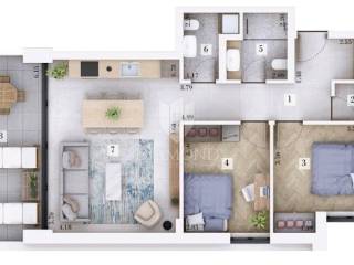 Visokokvalitetni materijali i pažljivo odabrana oprema osiguravaju ugodan boravak u svakom dijelu stana. MultiSplit sustav grijanja i hlađenja osigurava idealnu temperaturu tijekom cijele godine, dok podno grijanje u kuhinji i kupaonici dodatno povećava udobnost. Podne obloge kombiniraju elegantne talijanske pločice i toplinu drvenih površina u spavaćim sobama. Veliki stakleni portali donose obilje prirodnog svjetla, a izrađeni su od PVC stolarije s aluminijskom oblogom u antracit boji. Trostruko staklo pruža izvrsnu izolaciju, dok aluminijske rolete s električnim podizačima omogućuju lako upravljanje osvjetljenjem i privatnošću.