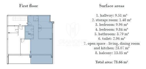 Stan je smješten na katu i odiše prostranošću i funkcionalnošću. Velika terasa stvara idealno mjesto za opuštanje, dok su dva osigurana parkirna mjesta praktičan dodatak svakodnevnom životu. Na parceli su predviđena i tri električna punjača, što budućim vlasnicima omogućava ekološki održivo rješenje za punjenje automobila.