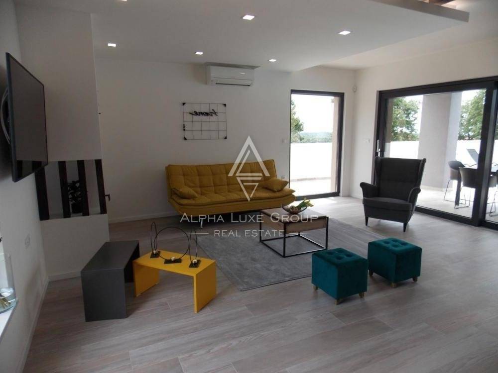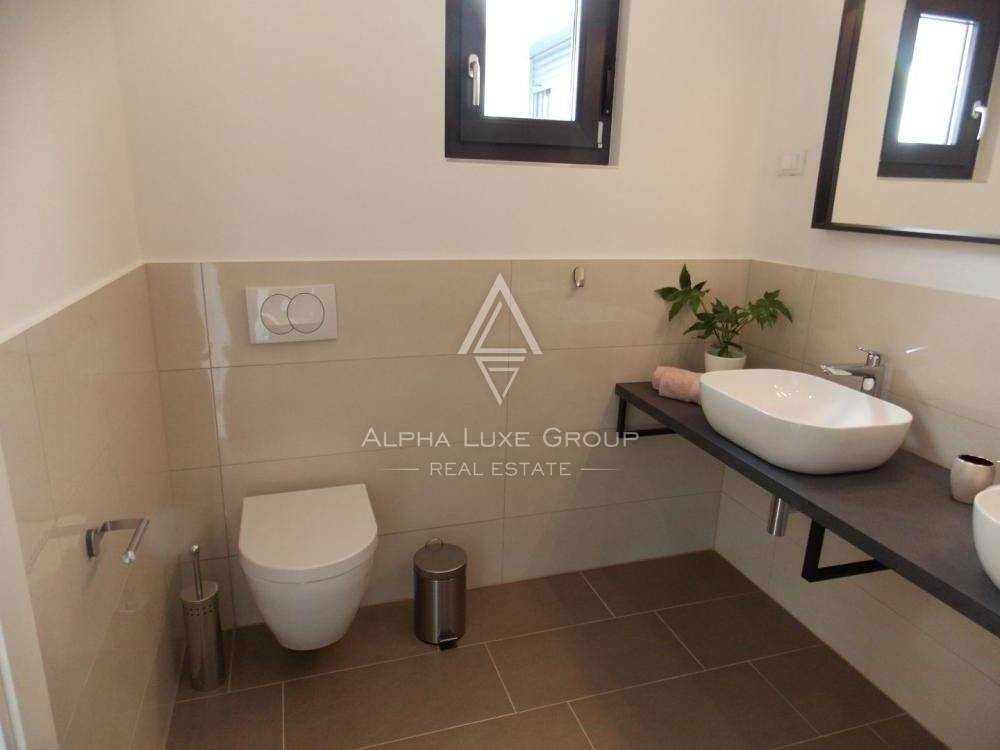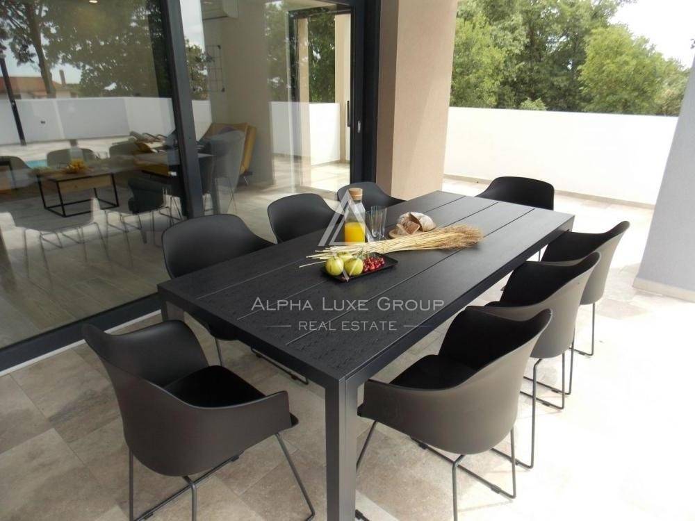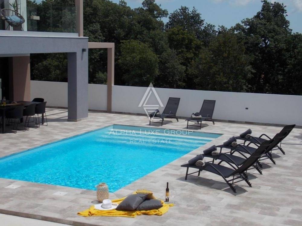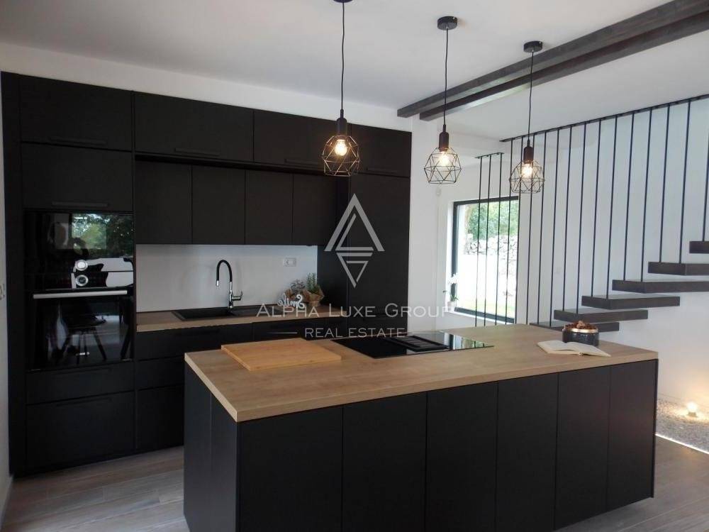 U prizemlju se nalazi praonica rublja, wc i kuhinja opremljena vrhunskom tehnologijom. Stambeni prostor otvorenog koncepta uključuje blagovaonu i dnevni boravak koji vodi do ljetne kuhinje opremljene roštiljem, bazenom od 30m2 i sunčalištem za opuštanje.