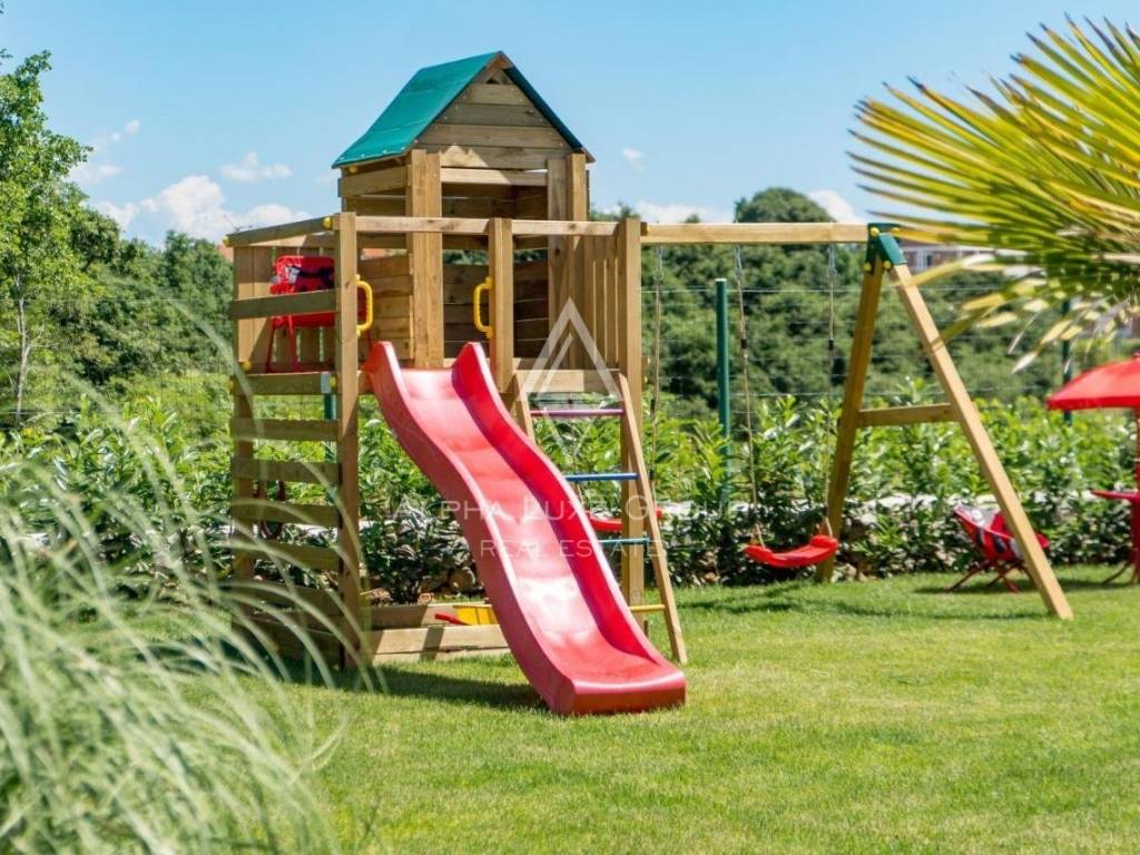 Prostrana okućnica je ograđena i lijepo uređena. Na njoj se nalazi dječje igralište i prelijepa vanjska kuhinja koju čini spoje kamena i drveta sa koje se izlazi na bazen sa sunčalištem. Ovaj vanjski prostor je idealan za opuštanje i druženje.