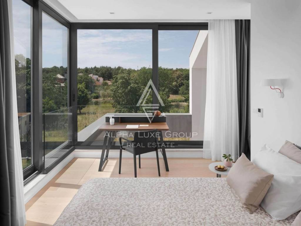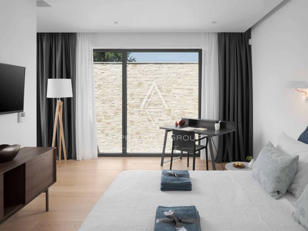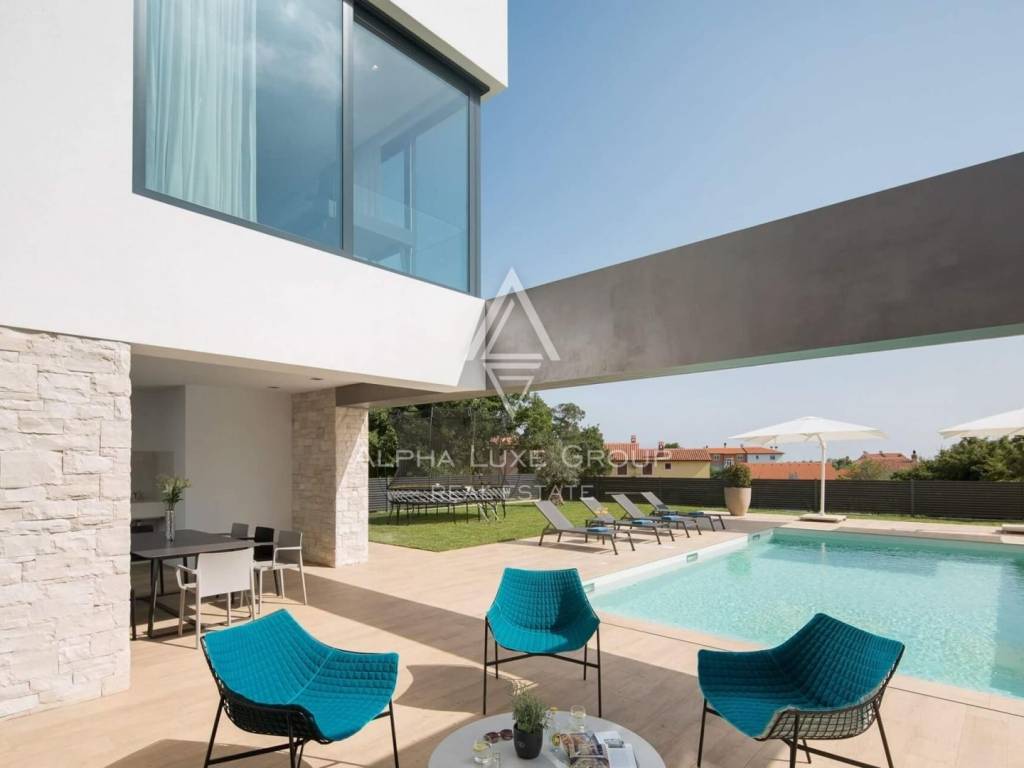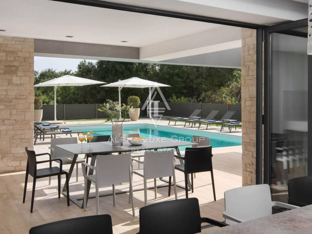ALPHA LUXE GROUP prodaje modernu vilu sa bazenom okruženu prirodom, Ližnjan, ISTRA Ova predivna moderna vila se nalazi u mirnom i tihom okruženju blizu najvećeg istarskog grada Pule. Ukupne je površine 400 m2 smještena na okućnici od 910 m2. Proteže se kroz suteren, prizemlje i kat. U suterenu se nalazi teretana i stolni tenis. U prizemlju se nalazi dnevni boravak s blagovaonicom, kuhinja i spavaća soba sa vlastitom kupaonicom. Natkrivena terasa ima veliku vanjsku blagovaonicu s ugrađenom vanjskom kuhinjom s roštiljem. Na katu su tri spavaće sobe sa vlastitim kupaonicama i obiljem prirodnog svjetla kroz velika panoramska staklena vrata koja povezuju unutarnji prostor s eksterijerom.