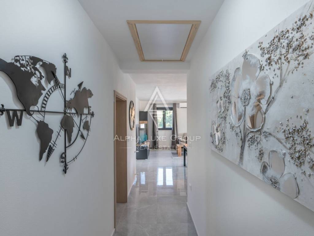 Sve tri spavaće sobe i dnevni boravak imaju izlaz na balkon koji izlazi na vanjsku natkrivenu terasu i plažu uz bazen. Kuća je opremljena klima uređajima, te je postavljena prva faza instalacija za centralno grijanje.