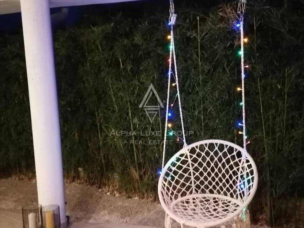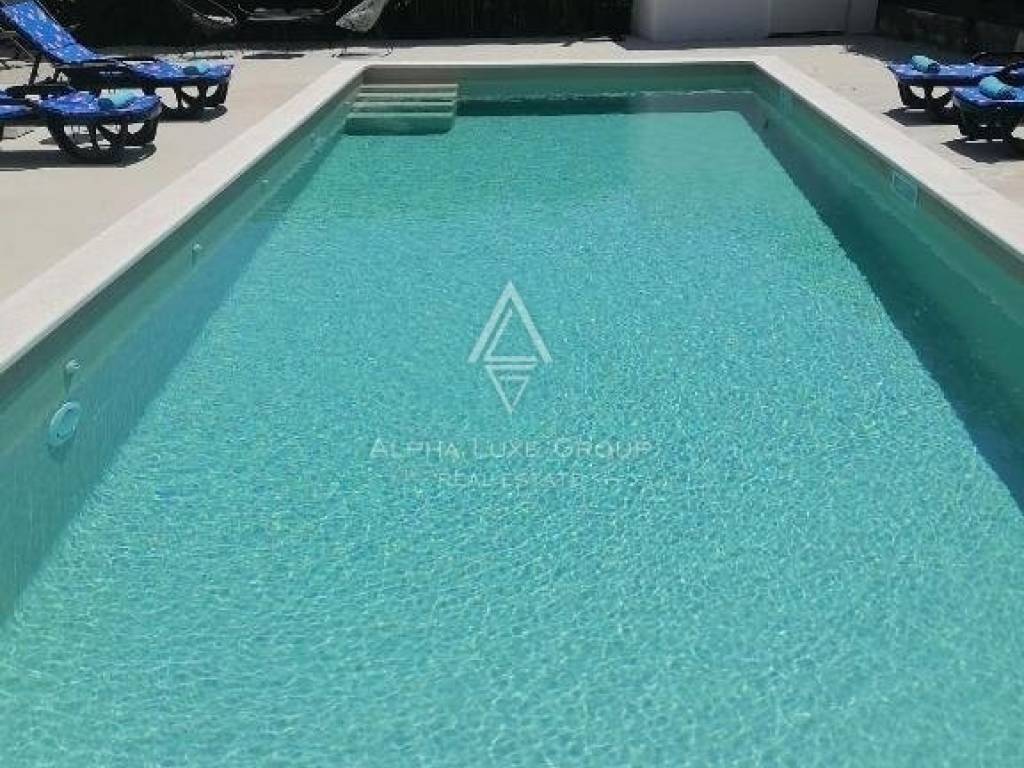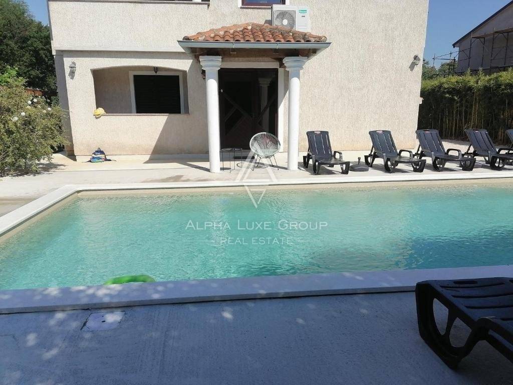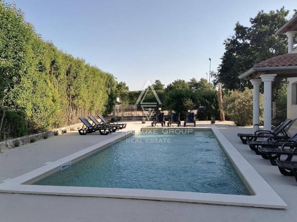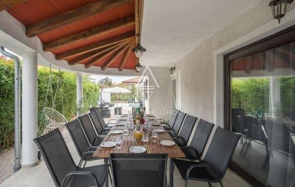 Izvana, predivni bazen od 40 m2 je središnji dio prednjeg dvorišta, okružen sunčalištem i prekrasno uređenim, ograđenim vrtom. Komfor se dodatno pojačava s tri privatna parkirna mjesta. Vila se nudi potpuno namještena i dekorirana, spremna za useljenje.